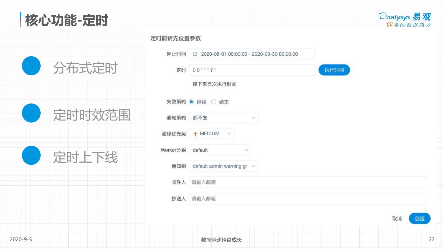 22 . 核心功能-定时 分布式定时 定时时效范围 定时上下线 2020-9-5 数据驱动精益成长 22