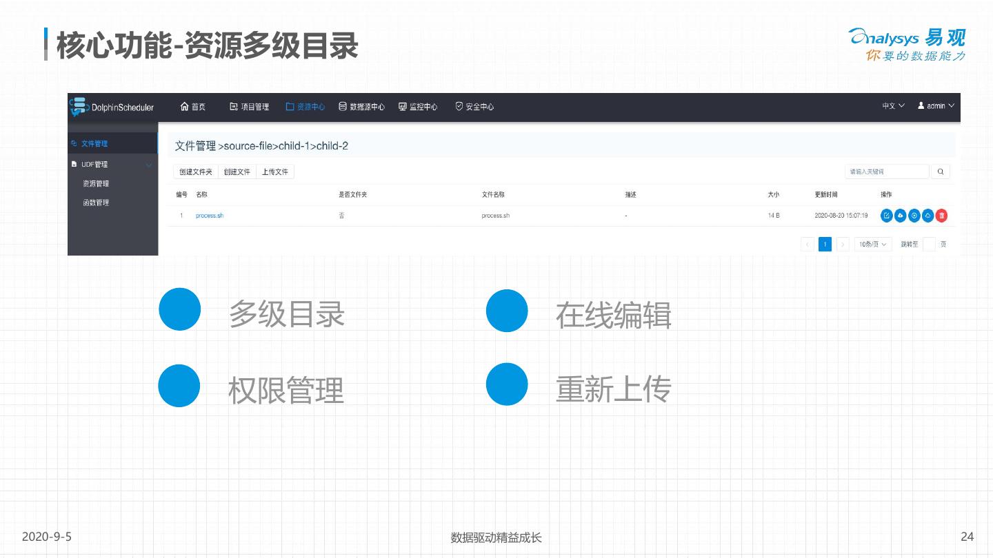 24 . 核心功能-资源多级目录 多级目录 在线编辑 权限管理 重新上传 2020-9-5 数据驱动精益成长 24