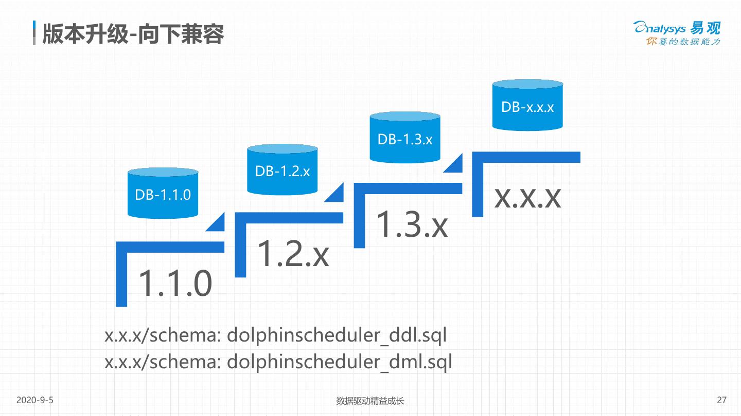 27 . 版本升级-向下兼容 DB-x.x.x DB-1.3.x DB-1.2.x DB-1.1.0 x.x.x 1.3.x 1.2.x 1.1.0 x.x.x/schema: dolphinscheduler_ddl.sql x.x.x/schema: dolphinscheduler_dml.sql 2020-9-5 数据驱动精益成长 27