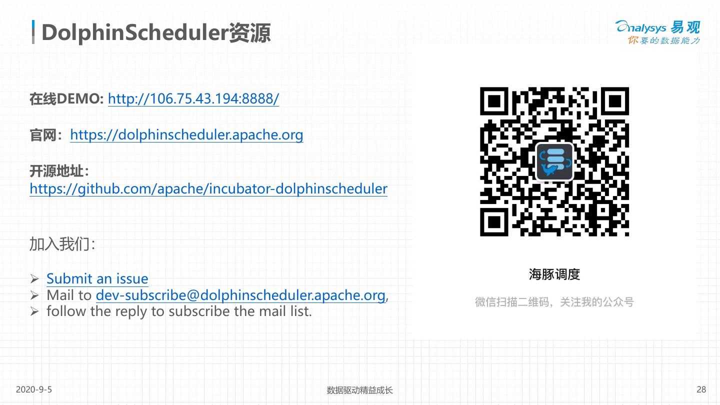 28 . DolphinScheduler资源 在线DEMO: http://106.75.43.194:8888/ 官网:https://dolphinscheduler.apache.org 开源地址: https://github.com/apache/incubator-dolphinscheduler 加入我们: Ø Submit an issue Ø Mail to dev-subscribe@dolphinscheduler.apache.org, Ø follow the reply to subscribe the mail list. 2020-9-5 数据驱动精益成长 28