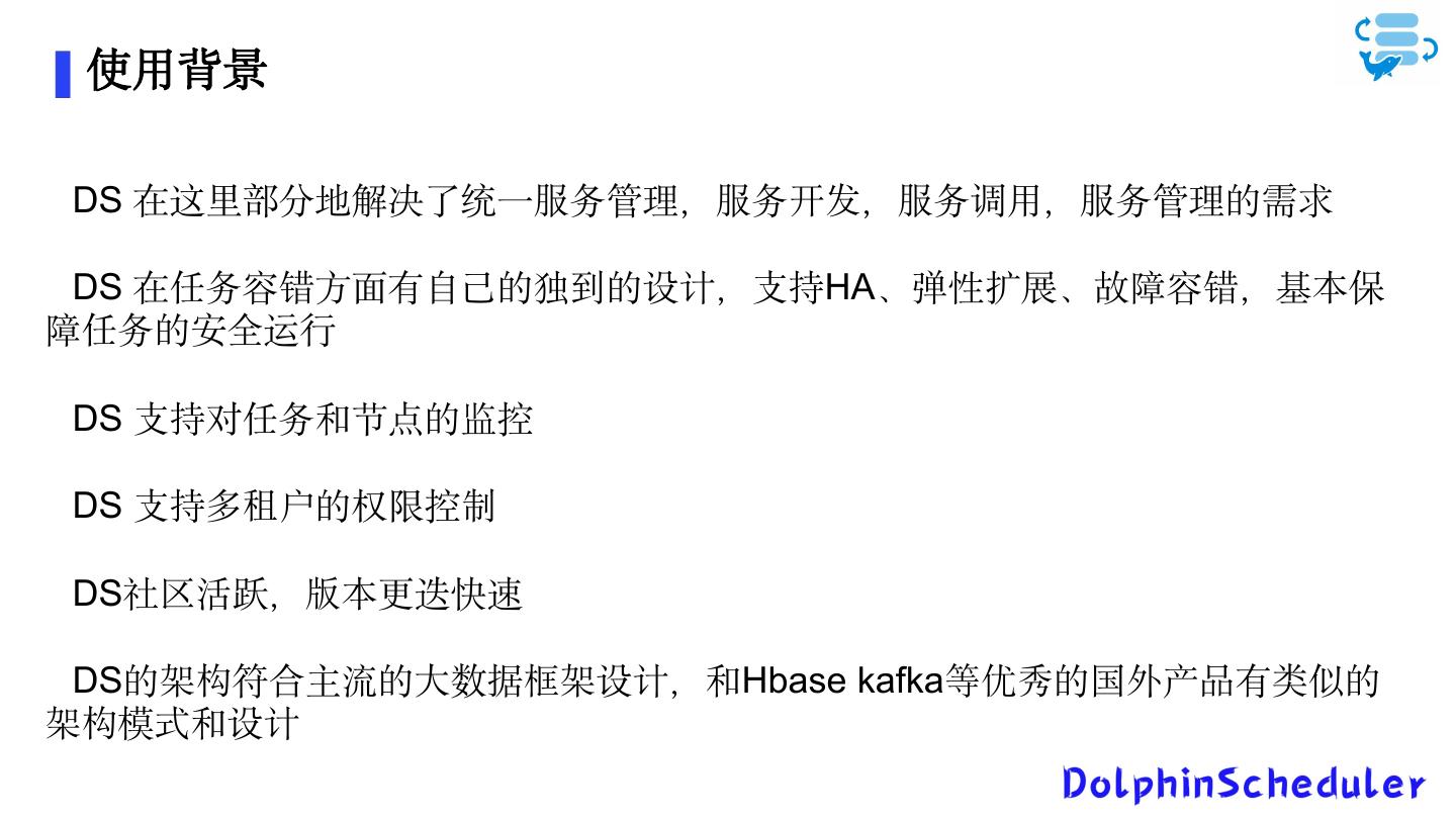 9 . 使用背景 DS 在这里部分地解决了统一服务管理,服务开发,服务调用,服务管理的需求 DS 在任务容错方面有自己的独到的设计,支持HA、弹性扩展、故障容错,基本保 障任务的安全运行 DS 支持对任务和节点的监控 DS 支持多租户的权限控制 DS社区活跃,版本更迭快速 DS的架构符合主流的大数据框架设计,和Hbase kafka等优秀的国外产品有类似的 架构模式和设计
