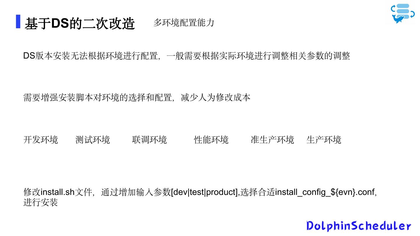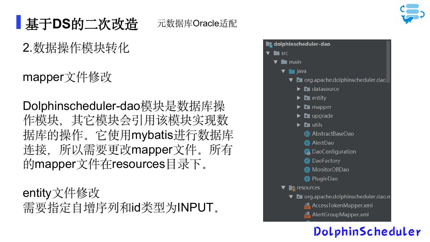 13 .基于DS的二次改造 元数据库Oracle适配 DS数据源转oracle需要完成数据需要完成数据初始化模块和数据操 作模块的适配。 数据初始化 1.1修改配置文件 2.0.*/apache-dolphinscheduler-2.0.*-bin/conf/config/install_config.conf 将mysql更改为oracle的配置 增加Oracle的application.yml 在2.0.*/apache-dolphinscheduler-2.0.*-bin/conf/目录下增加Oracle 的application.yml。