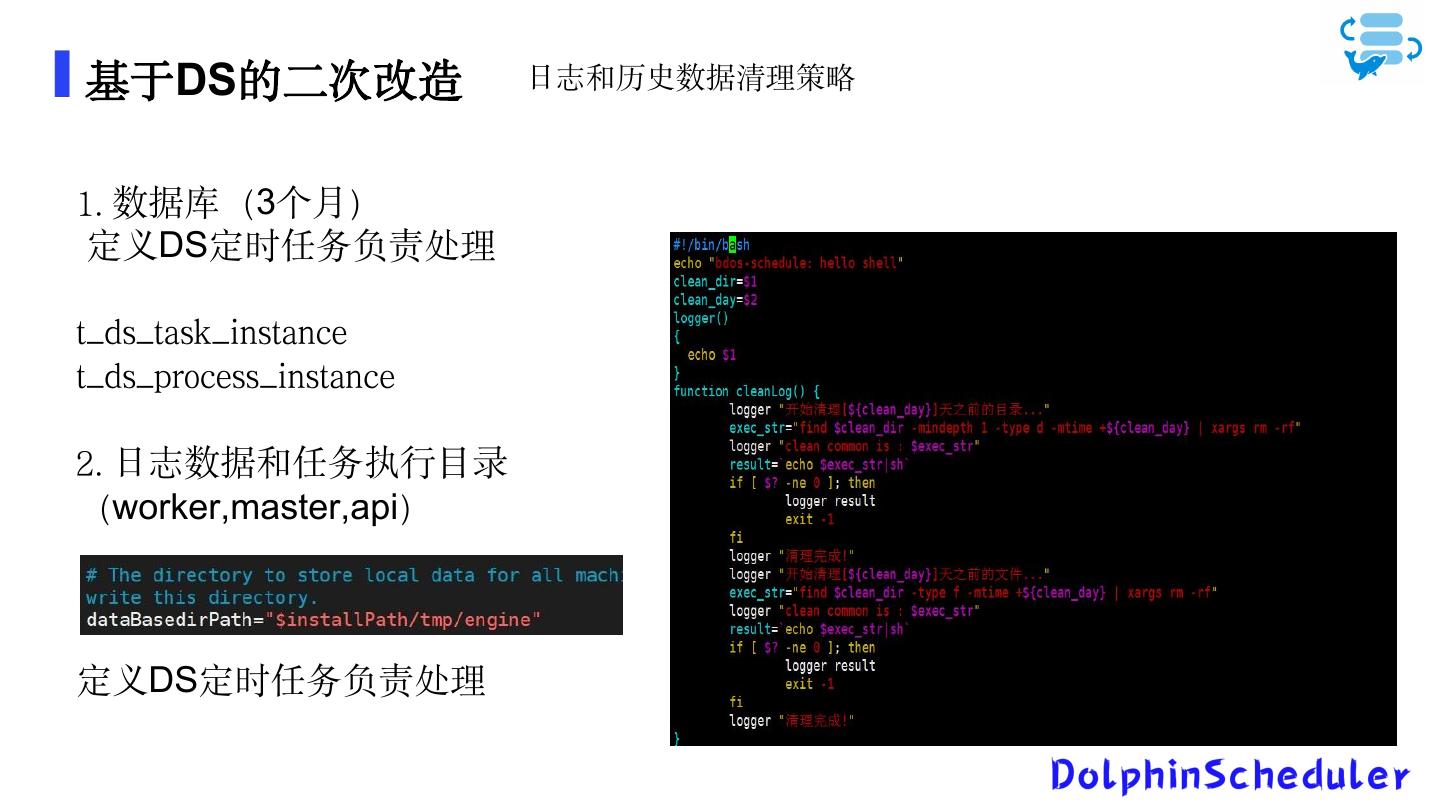 16 .基于DS的二次改造 日志和历史数据清理策略 1. 数据库(3个月) 定义DS定时任务负责处理 t_ds_task_instance t_ds_process_instance 2. 日志数据和任务执行目录 (worker,master,api) 定义DS定时任务负责处理