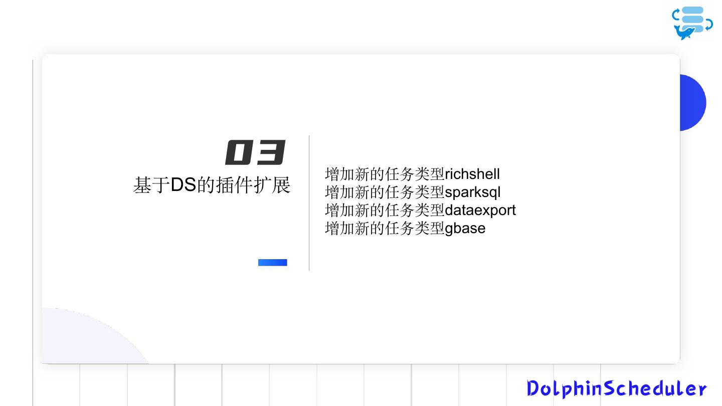 20 . 03 增加新的任务类型richshell 基于DS的插件扩展 增加新的任务类型sparksql 增加新的任务类型dataexport 增加新的任务类型gbase