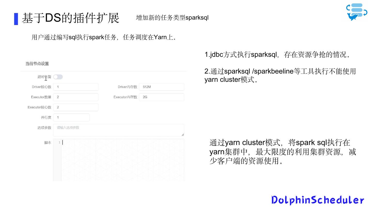 22 .基于DS的插件扩展 增加新的任务类型sparksql 用户通过编写sql执行spark任务,任务调度在Yarn上。 1.jdbc方式执行sparksql,存在资源争抢的情况。 2.通过sparksql /sparkbeeline等工具执行不能使用 yarn cluster模式。 通过yarn cluster模式,将spark sql执行在 yarn集群中,最大限度的利用集群资源,减 少客户端的资源使用。