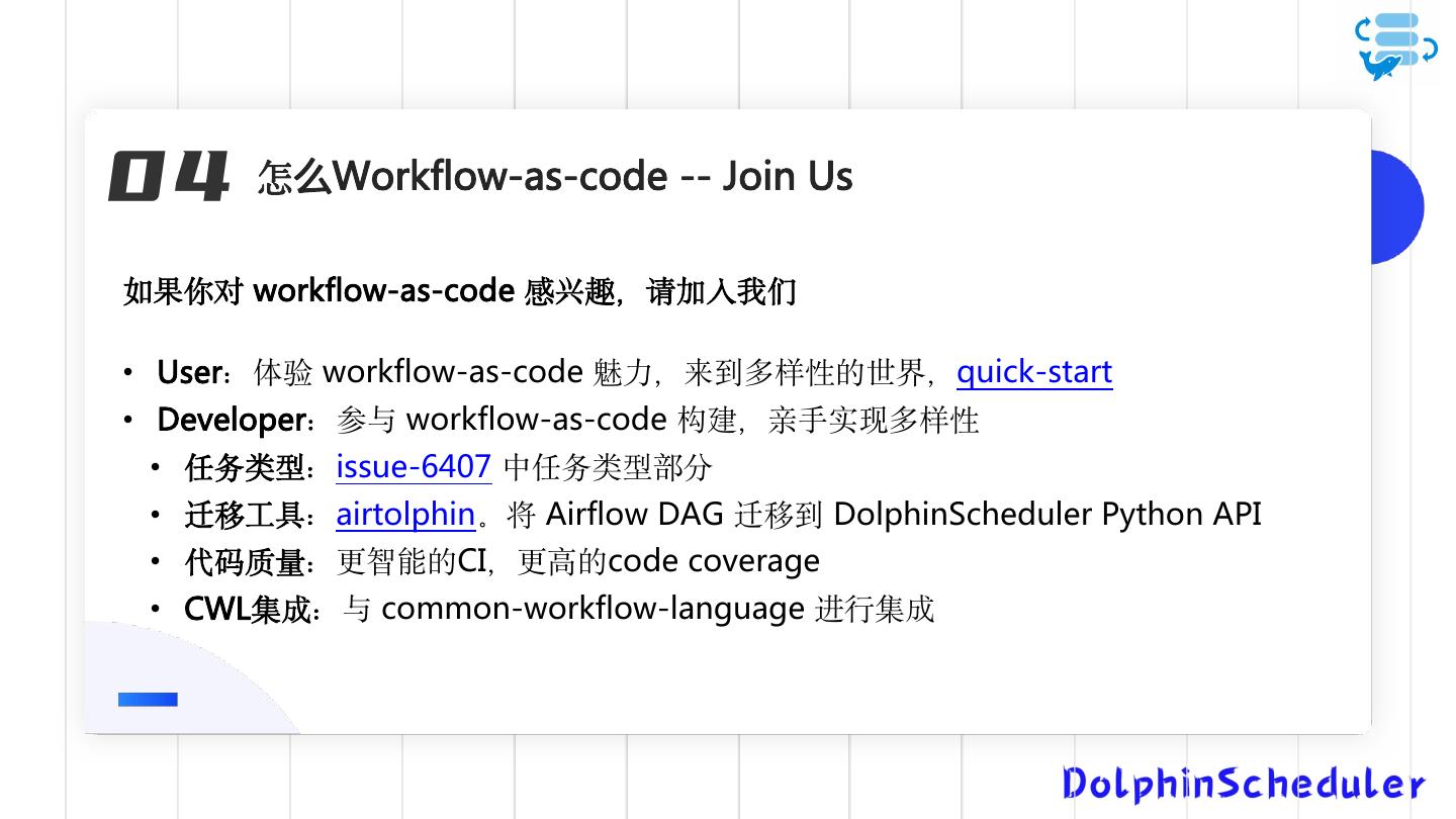 20 .04 怎么Workflow-as-code -- Join Us 如果你对 workflow-as-code 感兴趣,请加入我们 • User:体验 workflow-as-code 魅力,来到多样性的世界,quick-start • Developer:参与 workflow-as-code 构建,亲手实现多样性 • 任务类型:issue-6407 中任务类型部分 • 迁移工具:airtolphin。将 Airflow DAG 迁移到 DolphinScheduler Python API • 代码质量:更智能的CI,更高的code coverage • CWL集成:与 common-workflow-language 进行集成
