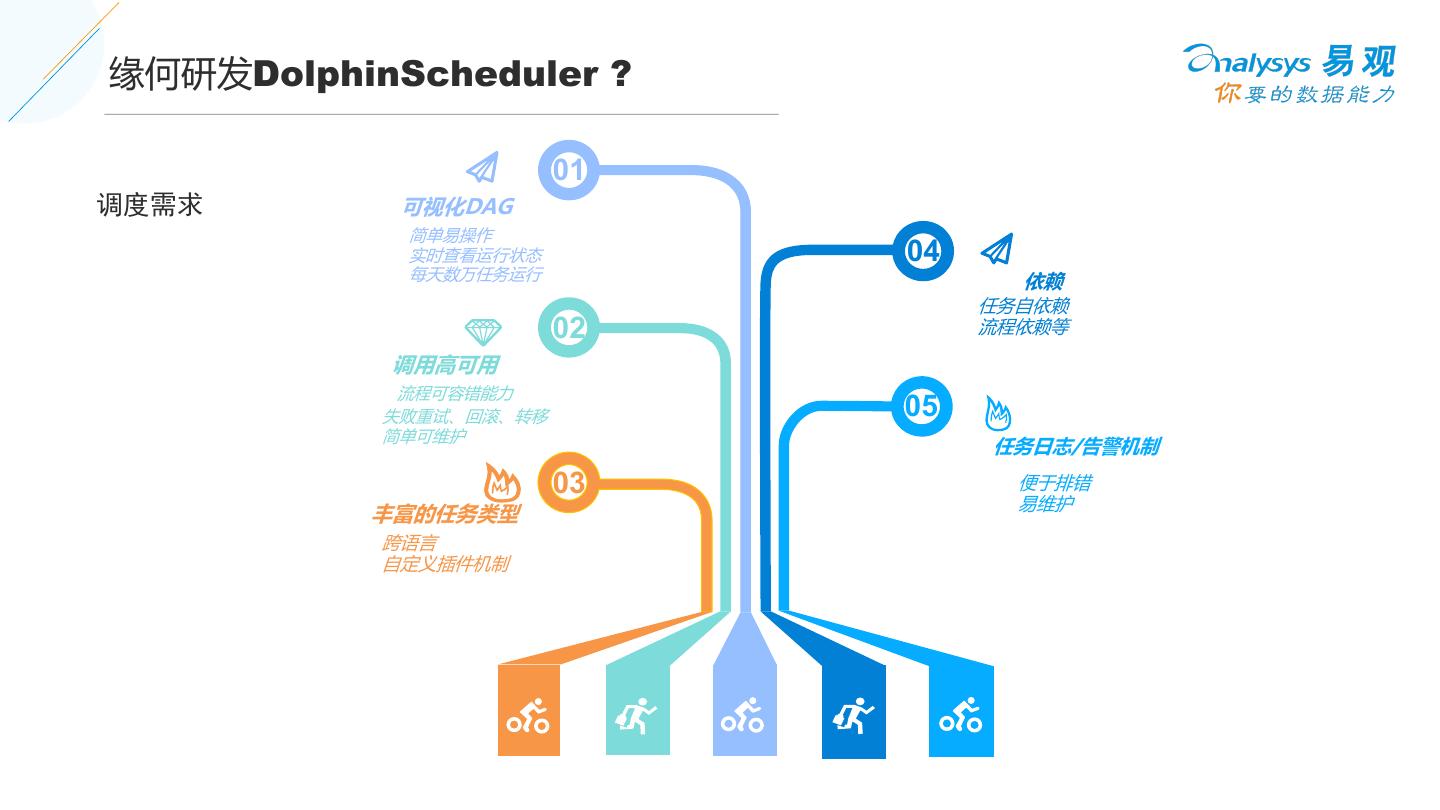 4 .缘何研发DolphinScheduler ? 01 调度需求 可视化DAG 简单易操作 实时查看运行状态 04 每天数万任务运行 依赖 任务自依赖 02 流程依赖等 调用高可用 流程可容错能力 失败重试、回滚、转移 05 简单可维护 任务日志/告警机制 03 便于排错 易维护 丰富的任务类型 跨语言 自定义插件机制