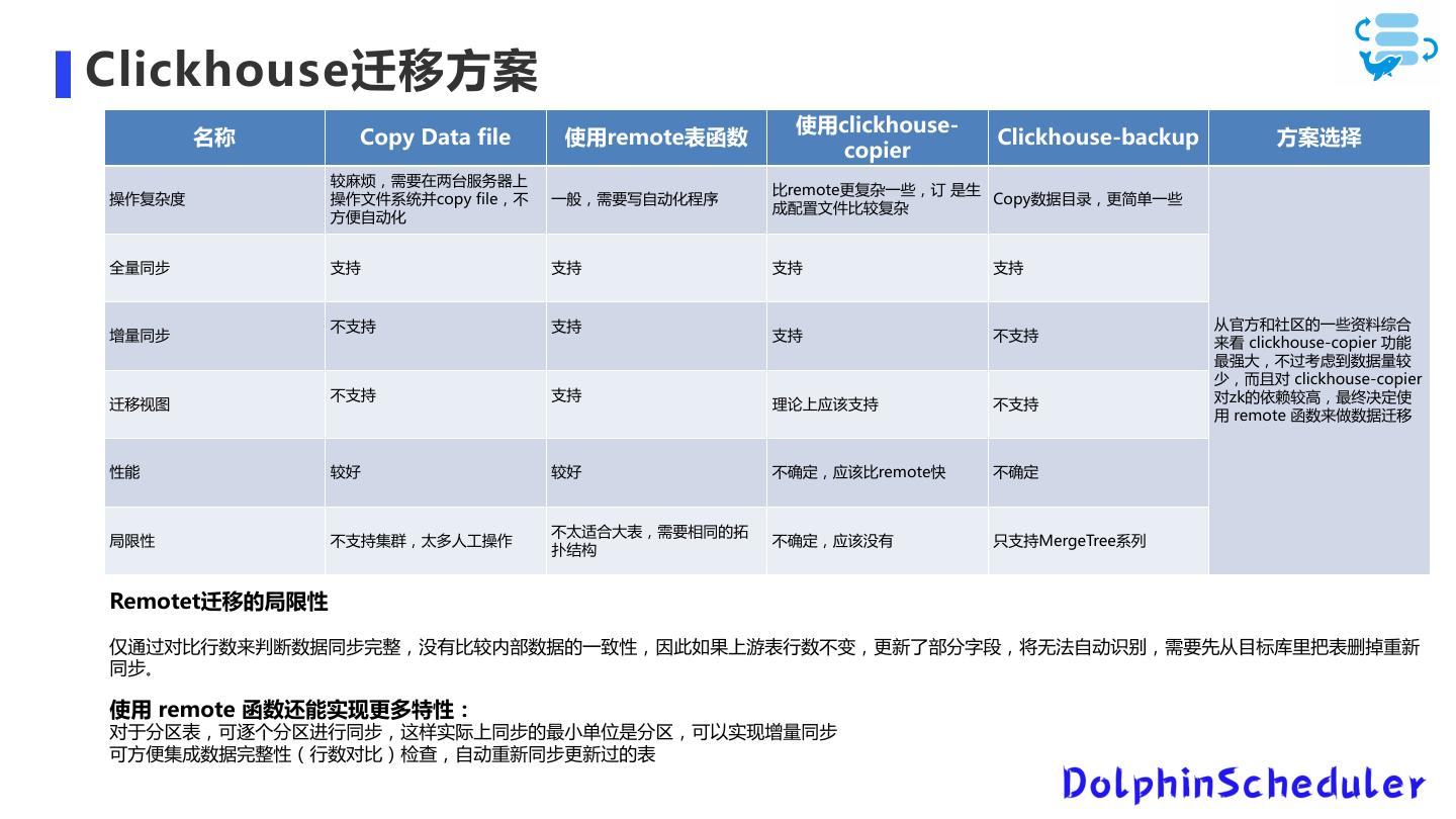 11 .Clickhouse迁移方案 使用clickhouse- 名称 Copy Data file 使用remote表函数 Clickhouse-backup 方案选择 copier 较麻烦,需要在两台服务器上 比remote更复杂一些,订 是生 操作复杂度 操作文件系统并copy file,不 一般,需要写自动化程序 Copy数据目录,更简单一些 成配置文件比较复杂 方便自动化 全量同步 支持 支持 支持 支持 不支持 支持 从官方和社区的一些资料综合 增量同步 支持 不支持 来看 clickhouse-copier 功能 最强大,不过考虑到数据量较 少,而且对 clickhouse-copier 不支持 支持 对zk的依赖较高,最终决定使 迁移视图 理论上应该支持 不支持 用 remote 函数来做数据迁移 性能 较好 较好 不确定,应该比remote快 不确定 不太适合大表,需要相同的拓 局限性 不支持集群,太多人工操作 不确定,应该没有 只支持MergeTree系列 扑结构 Remotet迁移的局限性 仅通过对比行数来判断数据同步完整,没有比较内部数据的一致性,因此如果上游表行数不变,更新了部分字段,将无法自动识别,需要先从目标库里把表删掉重新 同步。 使用 remote 函数还能实现更多特性: 对于分区表,可逐个分区进行同步,这样实际上同步的最小单位是分区,可以实现增量同步 可方便集成数据完整性(行数对比)检查,自动重新同步更新过的表