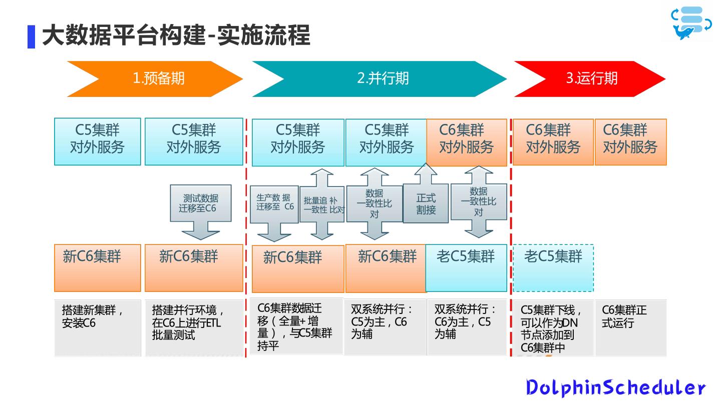 13 . 大数据平台构建-升级方案 方案一、原地升级 方案二、重构升级 原地升级 CDH升级路线 ! !"#$CDH%&'()*+ ! ./0$CDHZ[%将`)*+ %,-./01 CDH234 abc0Z [%将0$CDHZ ! 56 [defghZ[ ab34 "789:;<=>?@A ! 56 ! B6 "S)*+ijkl "CDEFGHIJKL "Km$CDEFGH 重构升级 "89MNOP ! B6 CDH 5.7 CDH6.3.0 ❑资源和QR "<=$>?@A "S)TU$VF@AWX "89no*+ YHZ[ "pq34rsKL "\]^_KL$CDEF GH ❑资源和目标 ")TU$VF@At0u6 vwxy `)u6zWX YHZ[ "9{|m$CD停FGH 方案选择 因方案一停机时间较长、原地升级失败后回滚风险较 大,有丢失数据的风险,所以选择了方案二