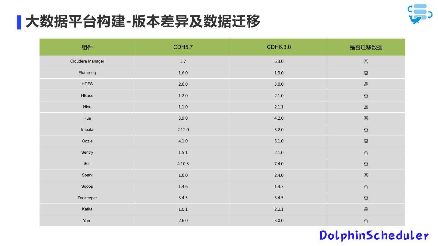 18 .大数据平台构建-版本差异及数据迁移 组件 CDH5.7 CDH6.3.0 是否迁移数据 Cloudera Manager 5.7 6.3.0 否 Flume-ng 1.6.0 1.9.0 否 HDFS 2.6.0 3.0.0 是 HBase 1.2.0 2.1.0 否 Hive 1.1.0 2.1.1 是 Hue 3.9.0 4.2.0 否 Impala 2.12.0 3.2.0 否 Oozie 4.1.0 5.1.0 否 Sentry 1.5.1 2.1.0 否 Solr 4.10.3 7.4.0 否 Spark 1.6.0 2.4.0 否 Sqoop 1.4.6 1.4.7 否 Zookeeper 3.4.5 3.4.5 否 Kafka 1.0.1 2.2.1 是 Yarn 2.6.0 3.0.0 否