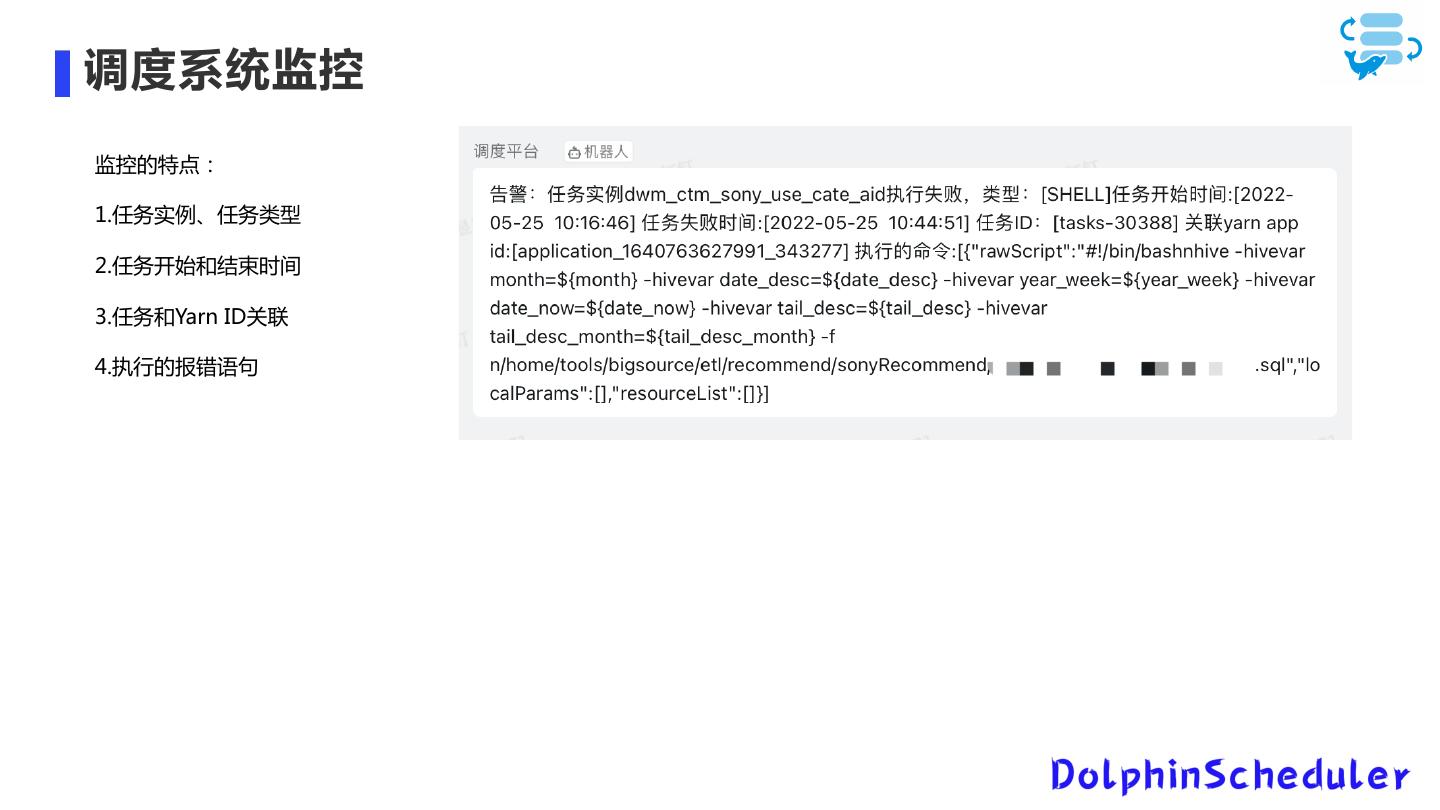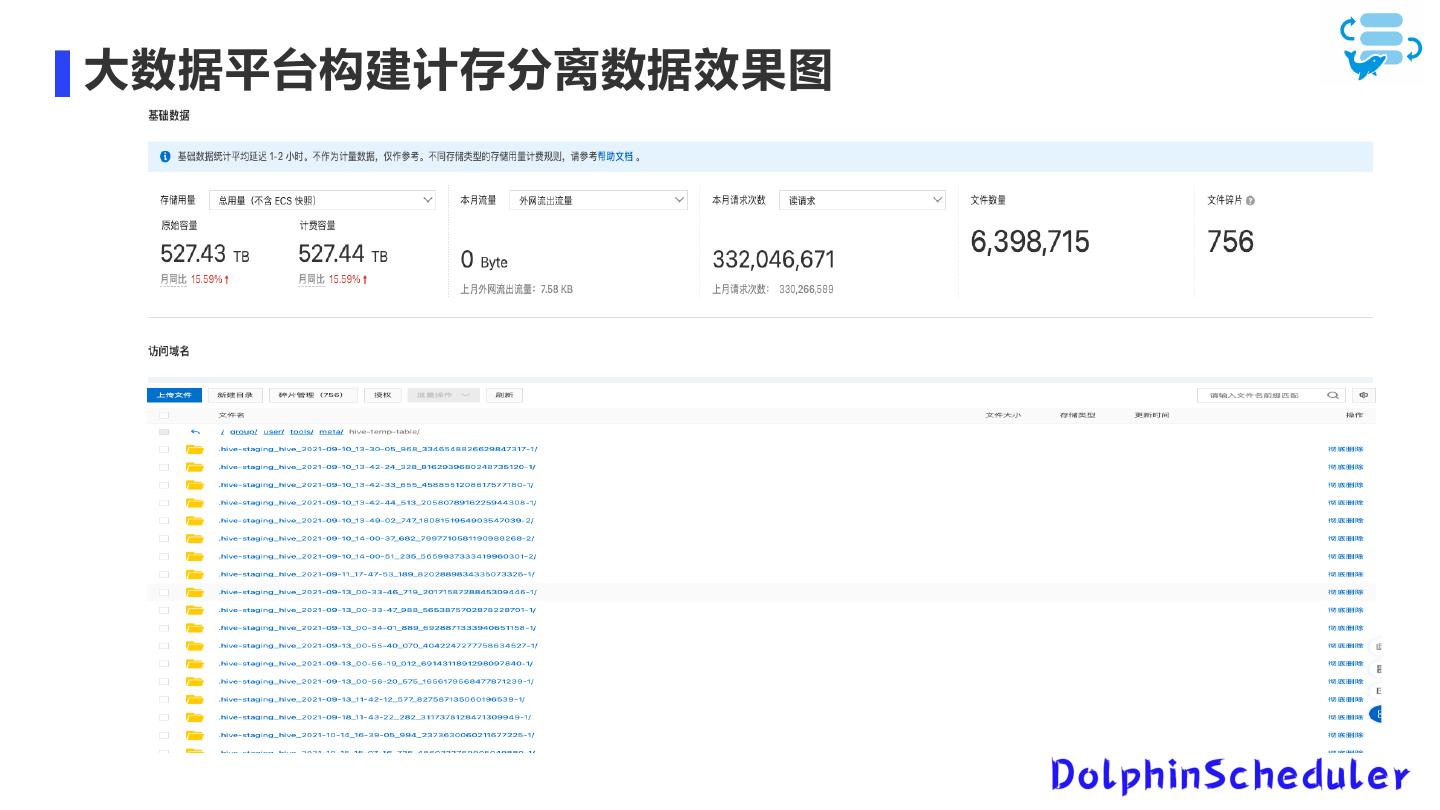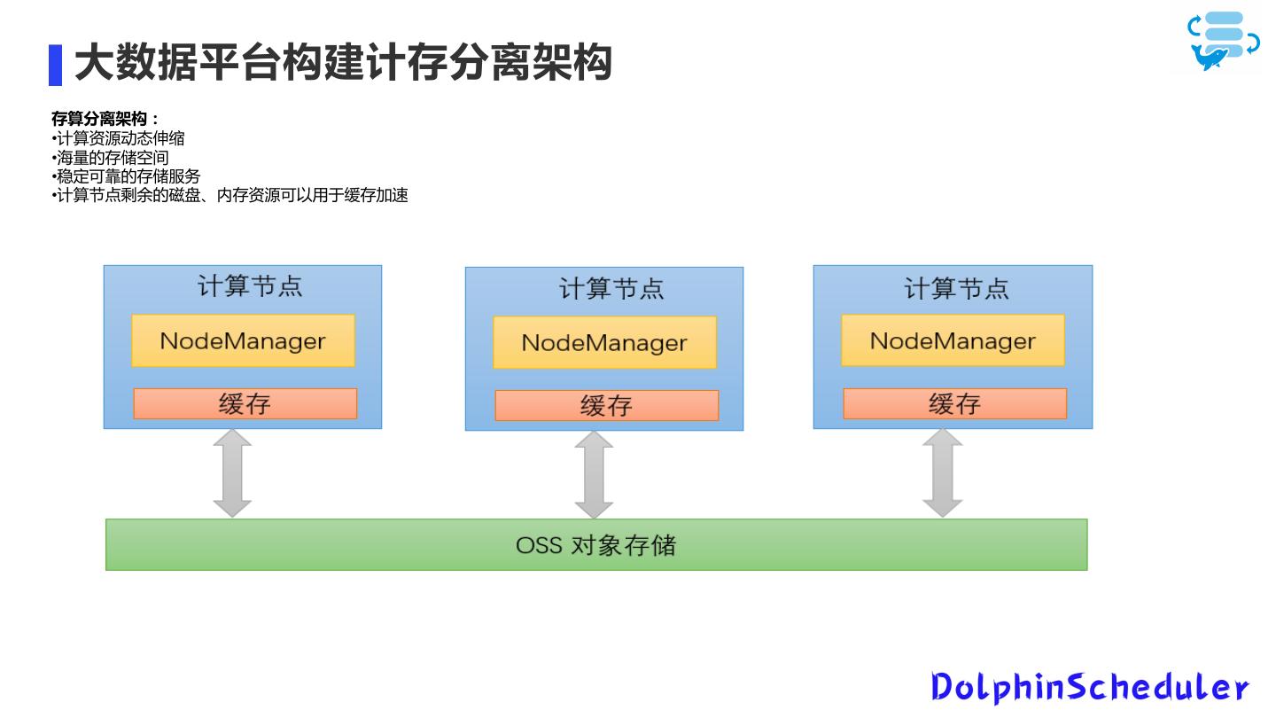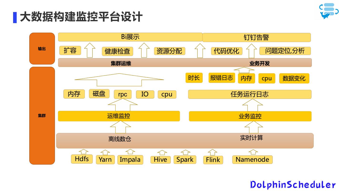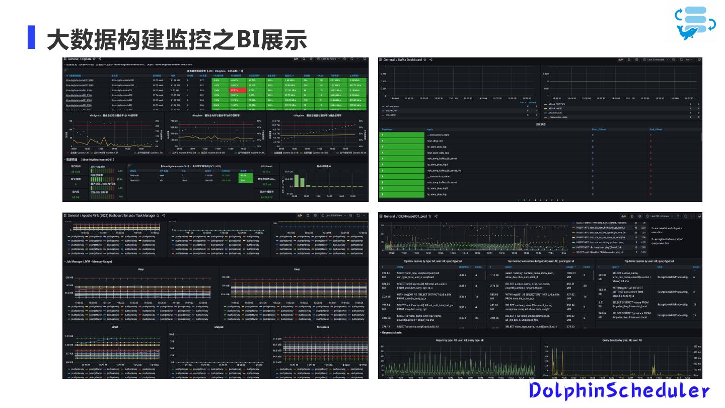 10 .大数据平台问题及解决方案 问题 解决方案 备注 迁移clickhouse 大数据混合部署 Hadoop版本较低 CDH从5.7升级到6.3.0(Hadoop3.0) 重构一套集群 MR计算时间较长 计算引擎有原来的MR切换到Spark 主要是跑hive-sql,代码改造较小 存储不够用 改用计存分离的方案(yarn + oss) 使用jindoFS为中间加速层 Ooize调度无法满足业务调度需求 改成dosphinscheudler调度系统 支持多数据源、支持重试、容错、告警等 1.组件级别 2.任务级别 3.服务器状态级别 无监控告警 Prometheus+Grafana+脚本 4.调度报错 管理节点单节点 使用HA(Namenode、ResourceManager) 可以进行故障转移