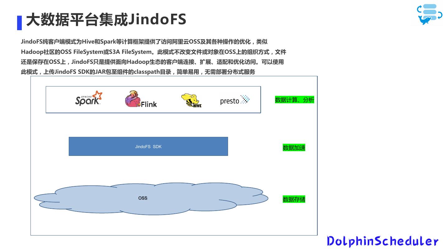 27 . 大数据平台集成JindoFS JindoFS纯客户端模式为Hive和Spark等计算框架提供了访问阿里云OSS及其各种操作的优化,类似 Hadoop社区的OSS FileSystem或S3A FileSystem。此模式不改变文件或对象在OSS上的组织方式,文件 还是保存在OSS上,JindoFS只是提供面向Hadoop生态的客户端连接、扩展、适配和优化访问。可以使用 此模式,上传JindoFS SDK的JAR包至组件的classpath目录,简单易用,无需部署分布式服务 数据计算、分析 JindoFS SDK 数据加速 OSS 数据存储