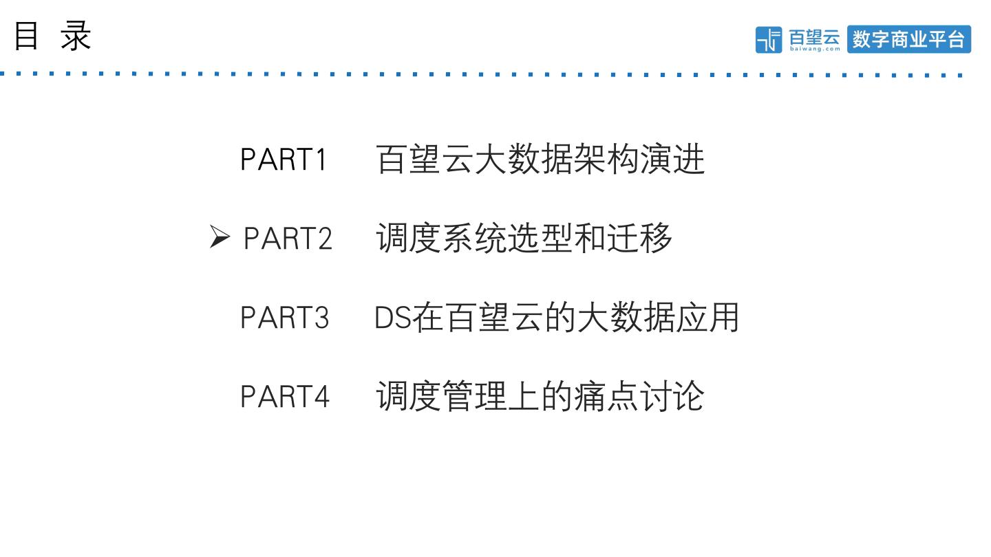 2 .目 录 PART1 百望云大数据架构演进 PART2 调度系统选型和迁移 PART3 DS在百望云的大数据应用 PART4 调度管理上的痛点讨论