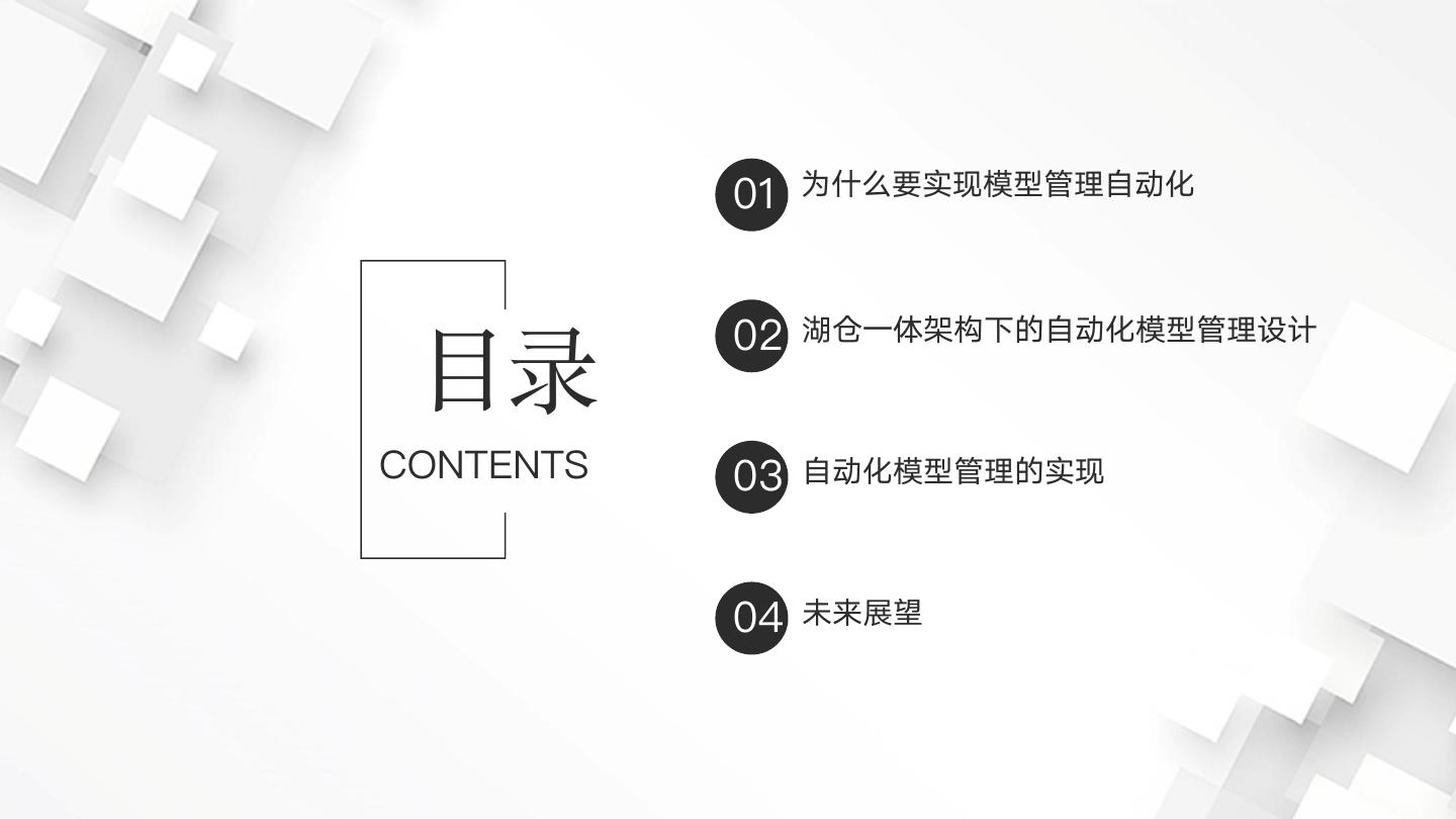 2 . 01 为什么要实现模型管理自动化 02 湖仓一体架构下的自动化模型管理设计 目录 CONTENTS 03 自动化模型管理的实现 04 未来展望