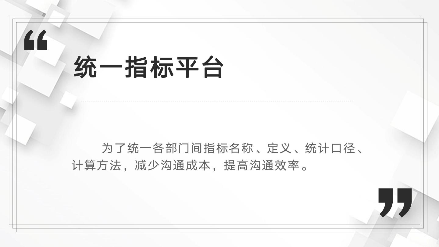 5 .统一指标平台 为了统一各部门间指标名称、定义、统计口径、 计算方法,减少沟通成本,提高沟通效率。