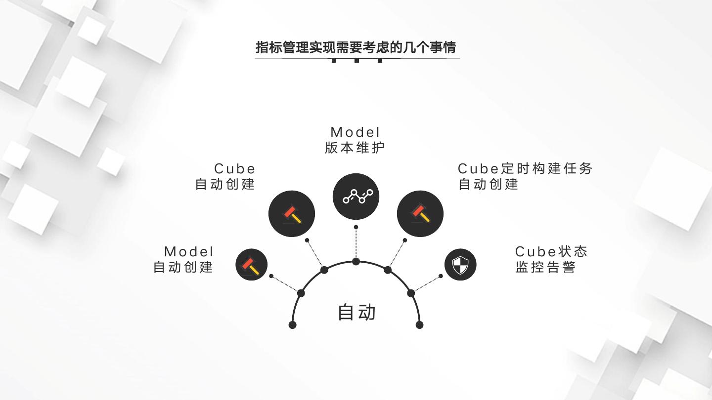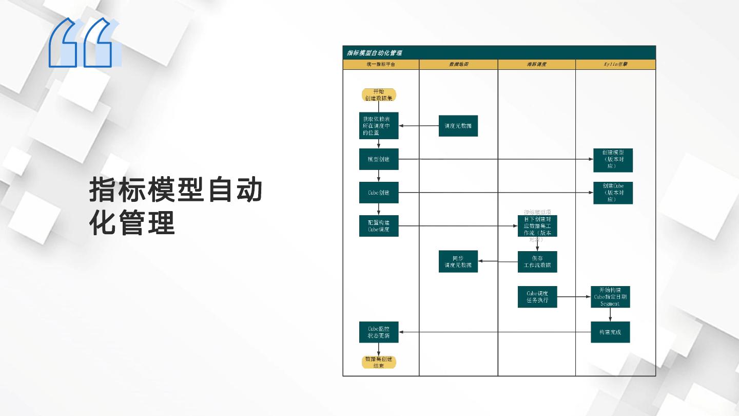 8 . 为什么要实现指标模型管理自动化 统一指标平台主要包括了数据集管理,指标管理,公式拆解,指标看板,驾驶舱以 及监控任务监控等,在自动化管理上主要涉及到对数据集和引擎模型的自动打通管理。 指标模型主要指指标所依赖的数据集,在配置指标之前,需要提前构建好数据集,包 括:模型所依赖事实表、维表、维度字段、度量字段配置 使用Kylin作为引擎底座,涉及到Cube的构建,Cube所关联的维度字段和度量字段 以及度量的聚合方式的配置,Fact表构建以及Cube构建调度策略配置 使用DolphinScheduler作为Fact表加工以及Cube构建