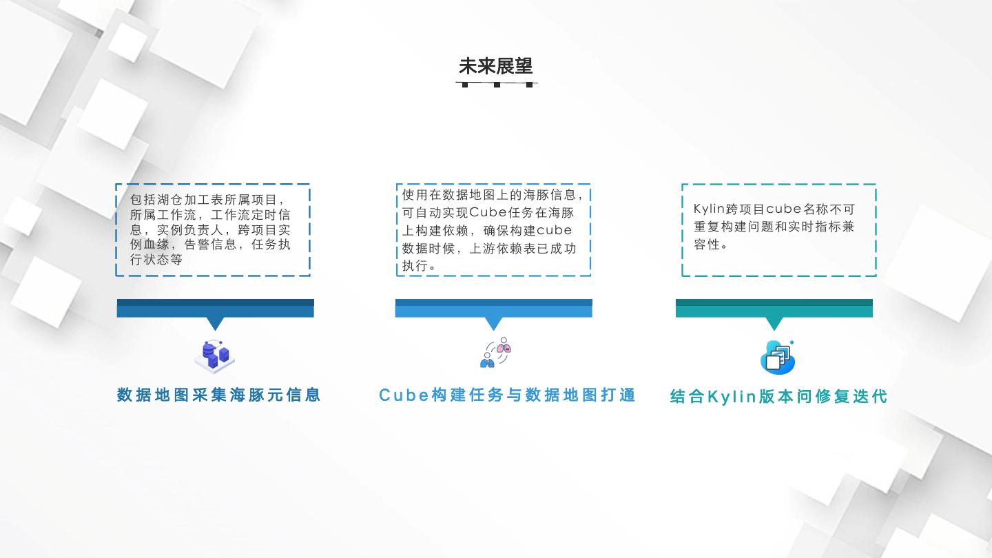 22 . 未来展望 包括湖仓加工表所属项目, 使用在数据地图上的海豚信息, 所属工作流,工作流定时信 可自动实现Cube任务在海豚 Kylin跨项目cube名称不可 息,实例负责人,跨项目实 上构建依赖,确保构建cube 重复构建问题和实时指标兼 例血缘,告警信息,任务执 数据时候,上游依赖表已成功 容性。 行状态等 执行。 数据地图采集海豚元信息 Cube构建任务与数据地图打通 结合Kylin版本问修复迭代