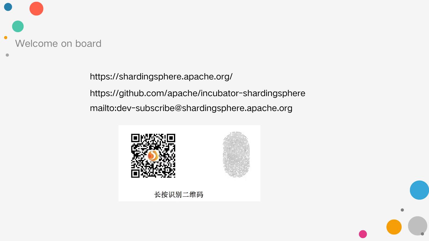22 .Welcome on board https://shardingsphere.apache.org/ https://github.com/apache/incubator-shardingsphere mailto:dev-subscribe@shardingsphere.apache.org
