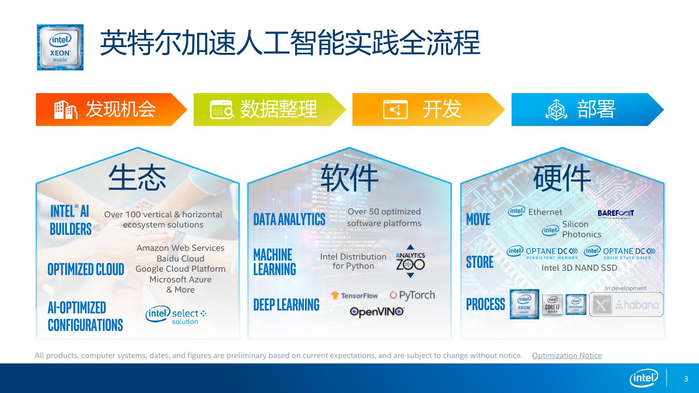 3 . 英特尔加速人工智能实践全流程 发现机会 数据整理 开发 部署 生态 软件 硬件 Intel® AI Over 100 vertical & horizontal Data Analytics Over 50 optimized Move Ethernet software platforms Builders ecosystem solutions Silicon Photonics Amazon Web Services Baidu Cloud Machine Intel Distribution Store Optimized cloud Google Cloud Platform Microsoft Azure Learning for Python Intel 3D NAND SSD & More In development AI-Optimized Deep Learning Process CONFIGurations All products, computer systems, dates, and figures are preliminary based on current expectations, and are subject to change without notice. Optimization Notice 3