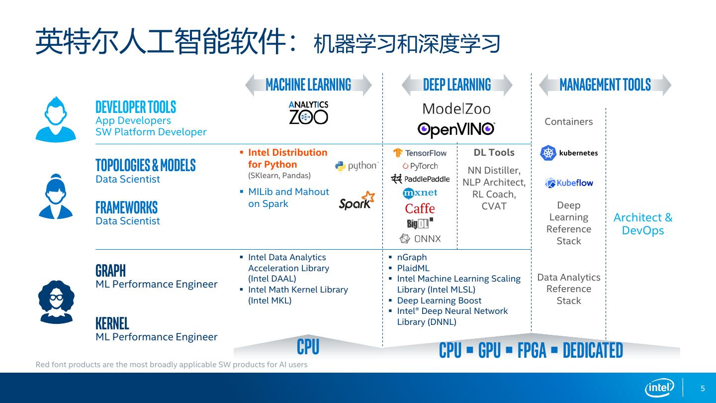 4 . Visit: www.intel.ai/technology 按需随处部署人工智能 with unprecedented hardware choice D C e e l v d o I g u c e d e If needed Automated Dedicated Flexible DeDicateD DL DL and more Driving Media/Vision Acceleration inference/training DL Training or Inference All products, computer systems, dates, and figures are preliminary based on current expectations, and are subject to change without notice. © 2019 Intel Corporation