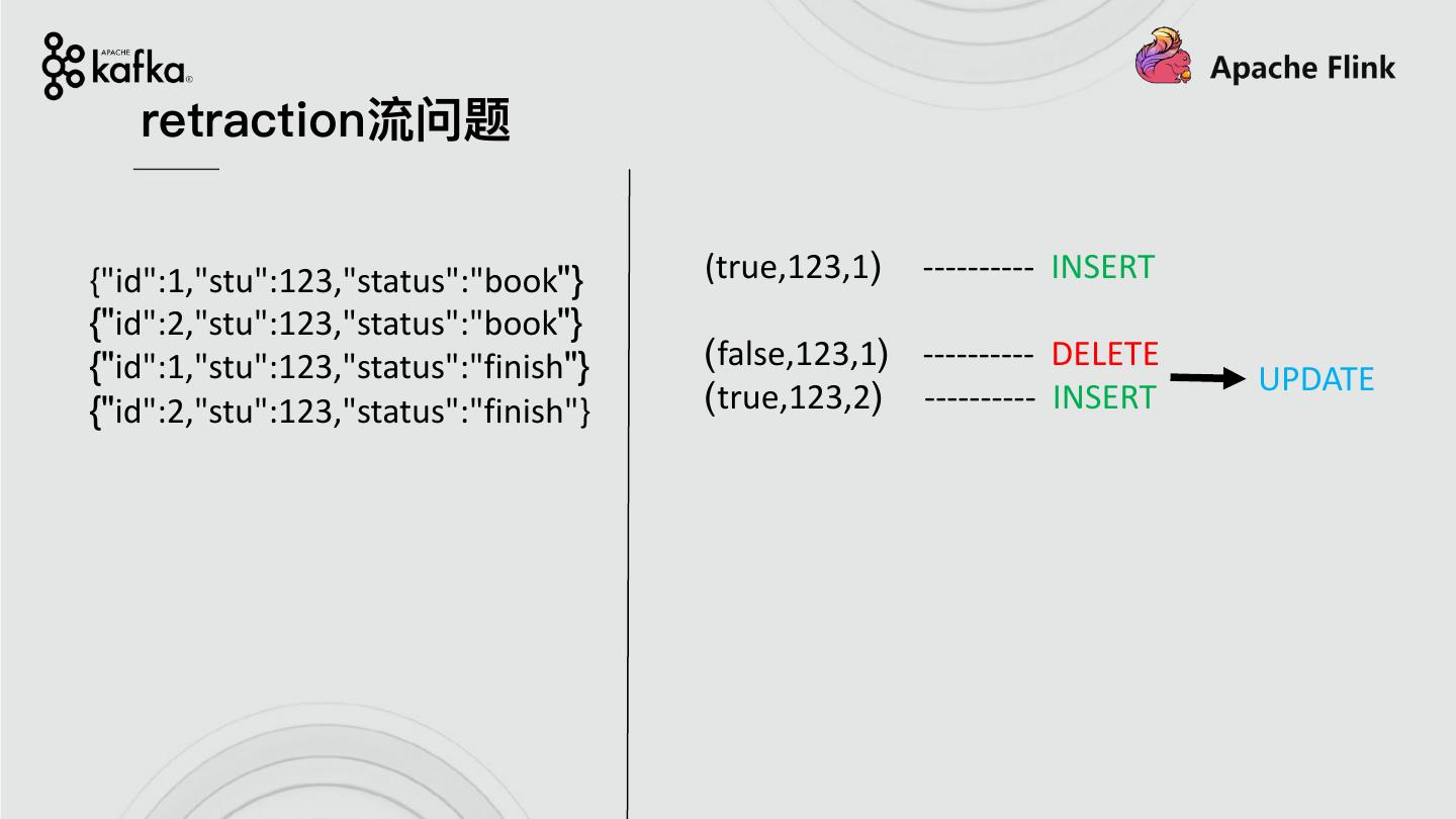 19 .{"id":1,"stu":123,"status":"book"} (true,123,1) ---------- INSERT {"id":2,"stu":123,"status":"book"} {"id":1,"stu":123,"status":"finish"} (false,123,1) ---------- DELETE UPDATE {"id":2,"stu":123,"status":"finish"} (true,123,2) ---------- INSERT