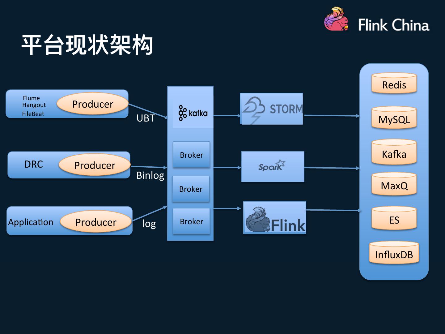 4 . 平台现状架构 Redis Flume Hangout Producer FileBeat UBT MySQL Broker KaAa DRC Producer Binlog Broker MaxQ Applica3on Producer log Broker ES InfluxDB