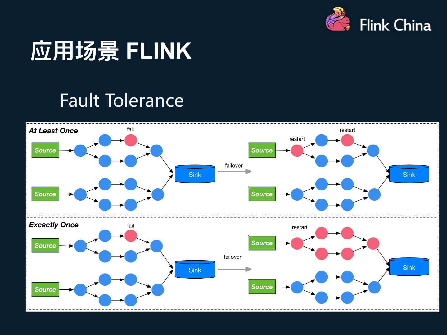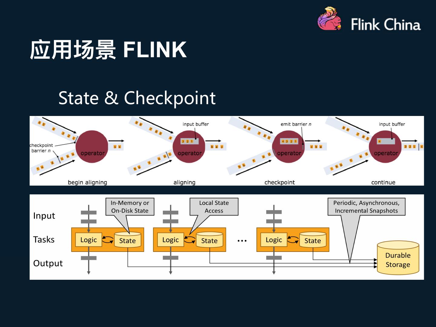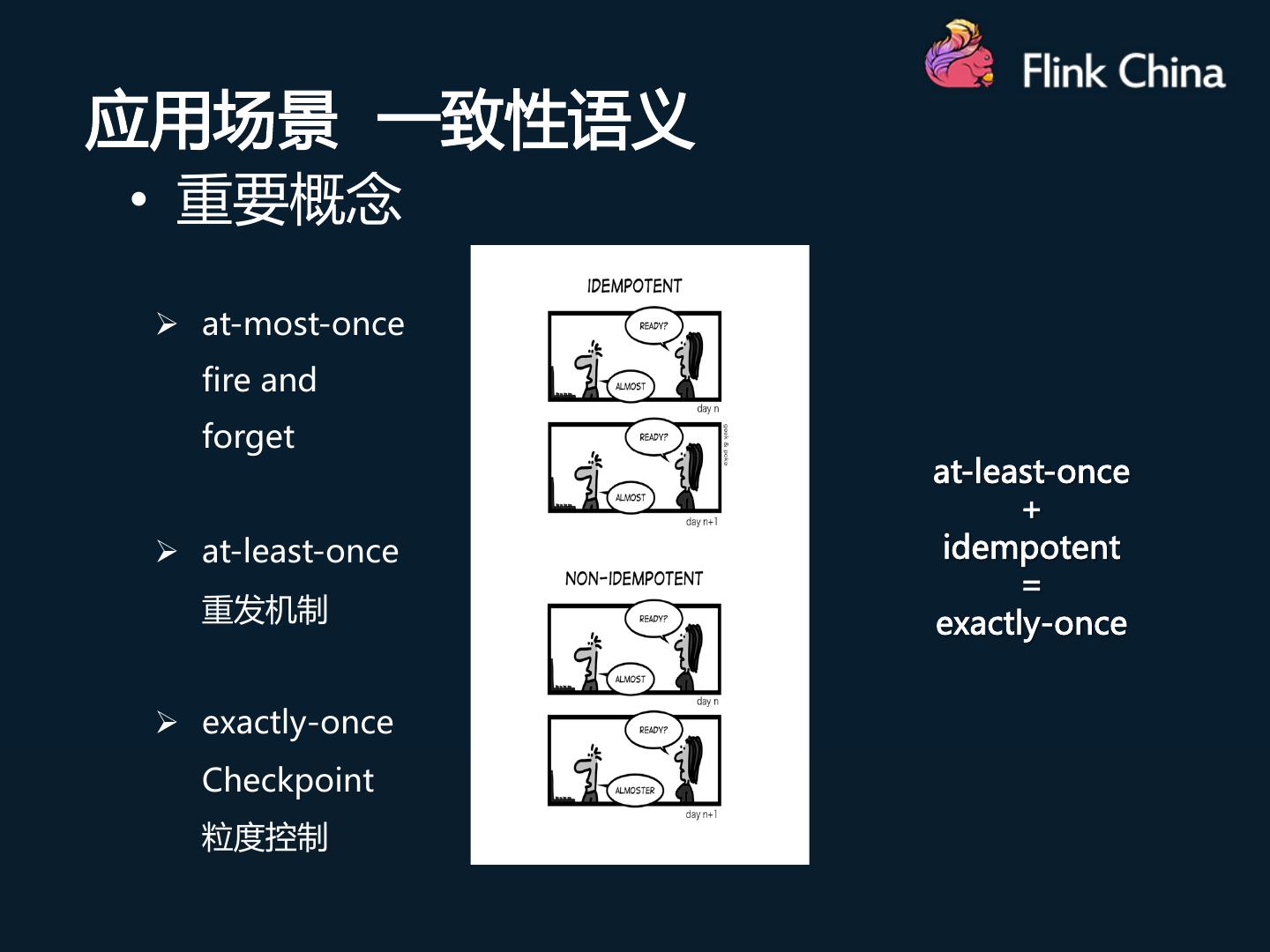 7 .应用场景 一致性语义 • 重要概念 Ø at-most-once fire and forget at-least-once + Ø at-least-once idempotent = 重发机制 exactly-once Ø exactly-once Checkpoint 粒度控制