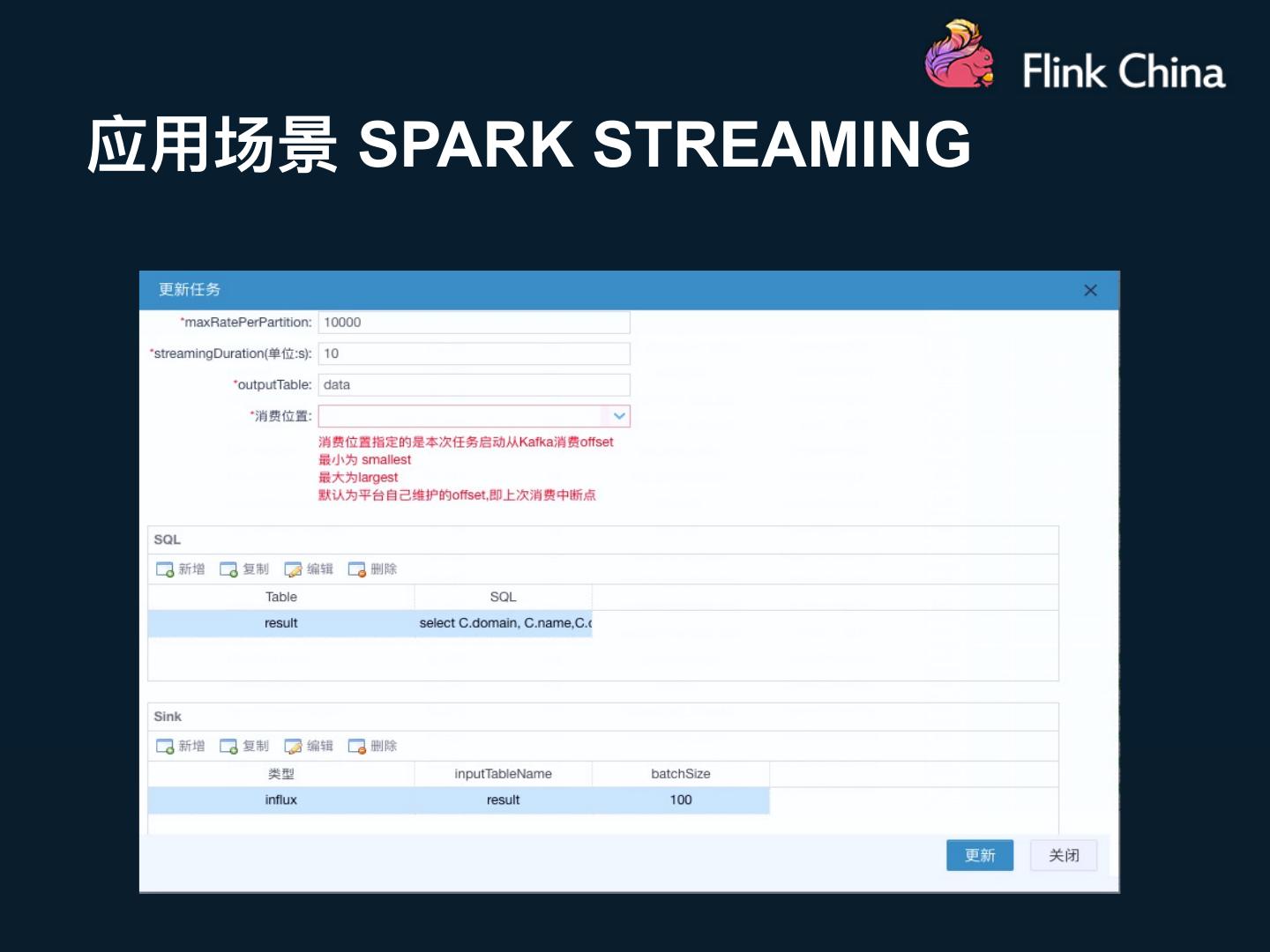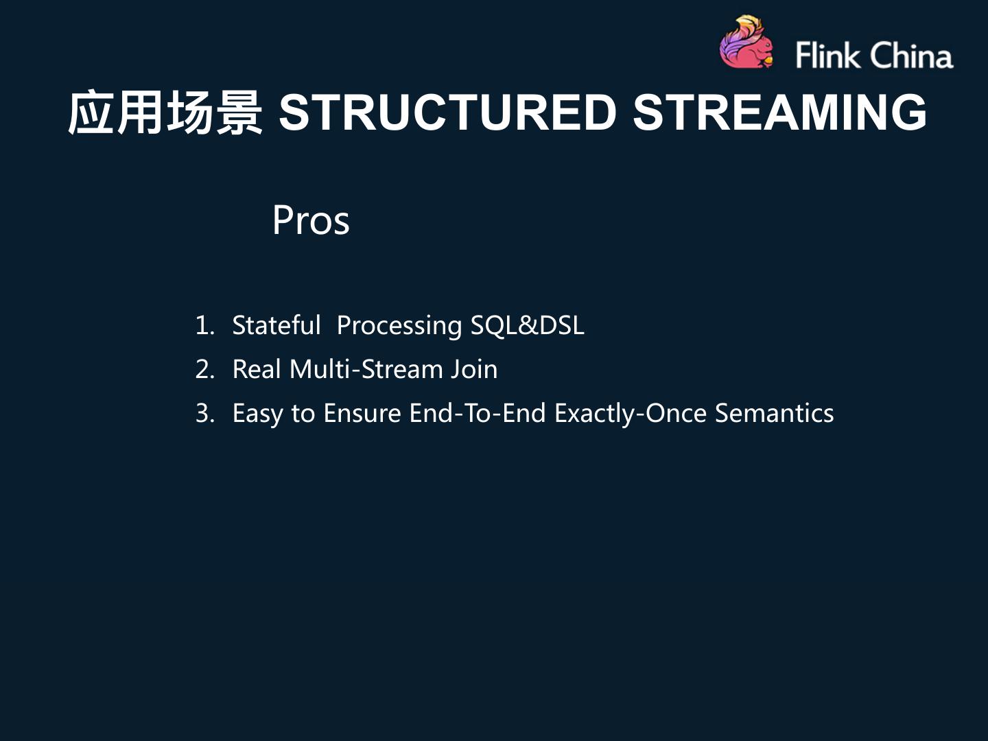23 .应⽤用场景 STRUCTURED STREAMING Cons 1. Trigger (Processing Time、 Continuous ) 2. Continuous Processing (Only Map-Like Operations) 3. Low End-To-End Latency With Exactly-Once Guarantees 4. CEP (Drools)