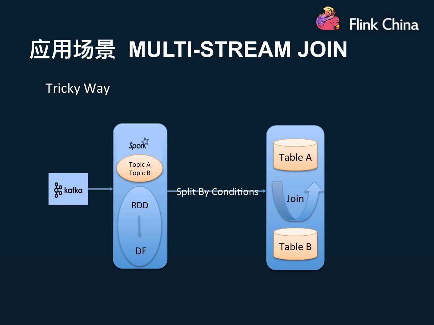 15 .应⽤用场景 MULTI-STREAM JOIN Tricky Way Table A Topic A Topic B Split By Condi3ons Join RDD DF Table B