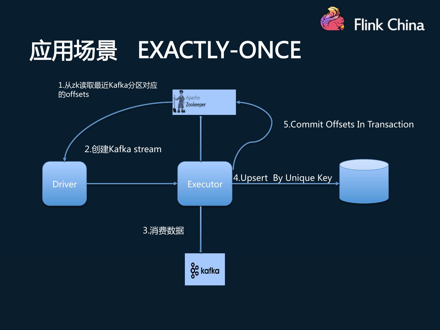 17 .应用场景 EXACTLY-ONCE 1.从zk读取最近Kafka分区对应 的offsets 5.Commit Offsets In Transaction 2.创建Kafka stream 4.Upsert By Unique Key Driver Executor 3.消费数据