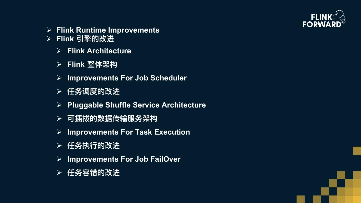 10 .Ø Flink Runtime Improvements Ø Flink Ø Flink Architecture Ø Flink Ø Improvements For Job Scheduler Ø Ø Pluggable Shuffle Service Architecture Ø Ø Improvements For Task Execution Ø Ø Improvements For Job FailOver Ø