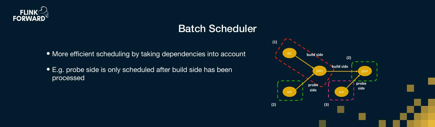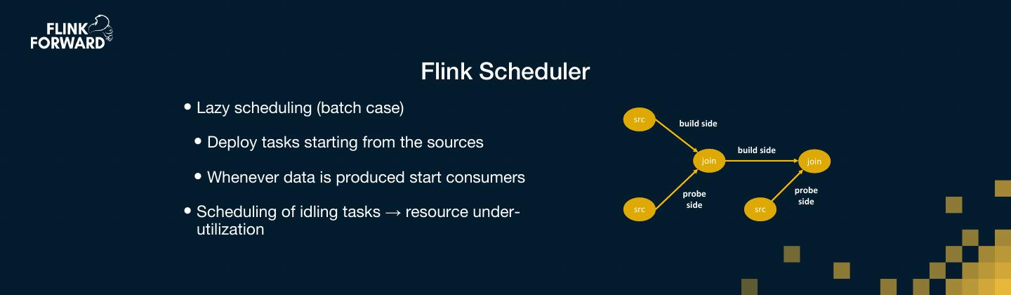 7 . Flink Scheduler • Lazy scheduling (batch case) src build side • Deploy tasks starting from the sources build side join join • Whenever data is produced start consumers probe probe side • Scheduling of idling tasks → resource under- src side src utilization