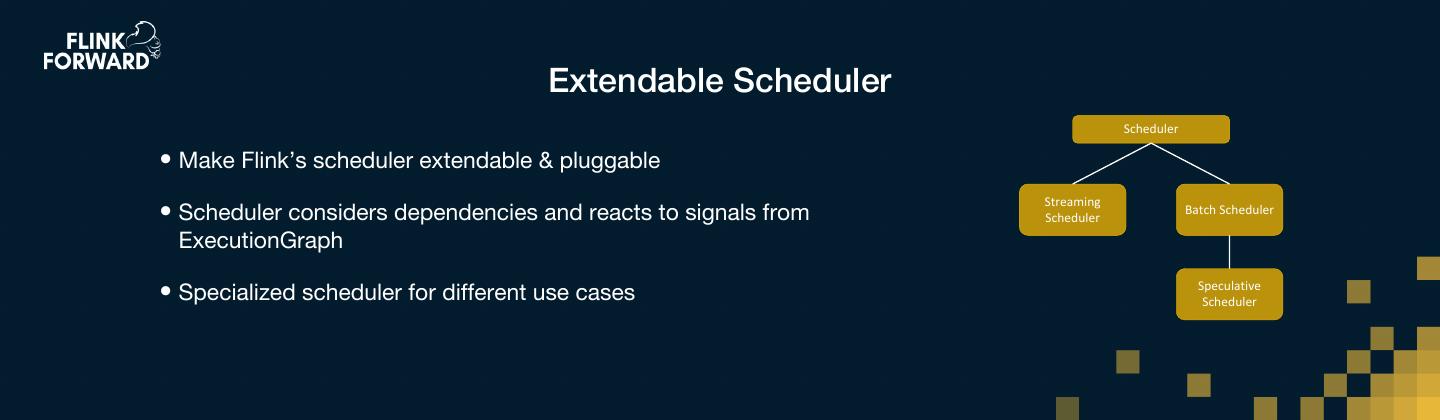 9 . Extendable Scheduler Scheduler • Make Flink’s scheduler extendable & pluggable • Scheduler considers dependencies and reacts to signals from Streaming Scheduler Batch Scheduler ExecutionGraph • Specialized scheduler for different use cases Speculative Scheduler