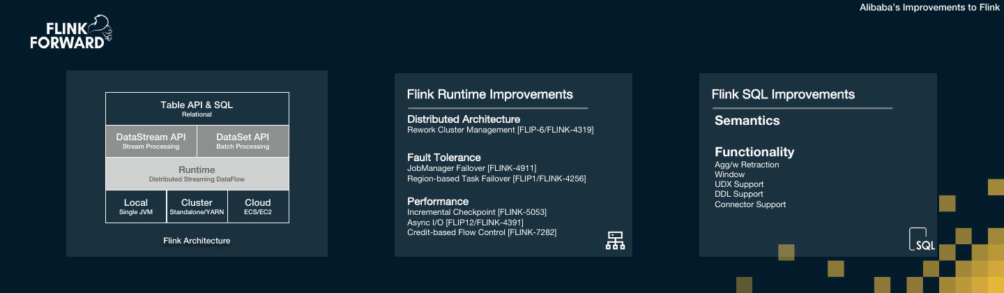 9 . Alibaba’s Improvements to Flink Flink Runtime Improvements Flink SQL Improvements Table API & SQL Relational Distributed Architecture Semantics Rework Cluster Management [FLIP-6/FLINK-4319] DataStream API DataSet API Stream Processing Batch Processing Fault Tolerance Functionality JobManager Failover [FLINK-4911] Agg/w Retraction Runtime Window Distributed Streaming DataFlow Region-based Task Failover [FLIP1/FLINK-4256] UDX Support DDL Support Local Cluster Cloud Performance Connector Support Single JVM Standalone/YARN ECS/EC2 Incremental Checkpoint [FLINK-5053] Async I/O [FLIP12/FLINK-4391] Credit-based Flow Control [FLINK-7282] Flink Architecture