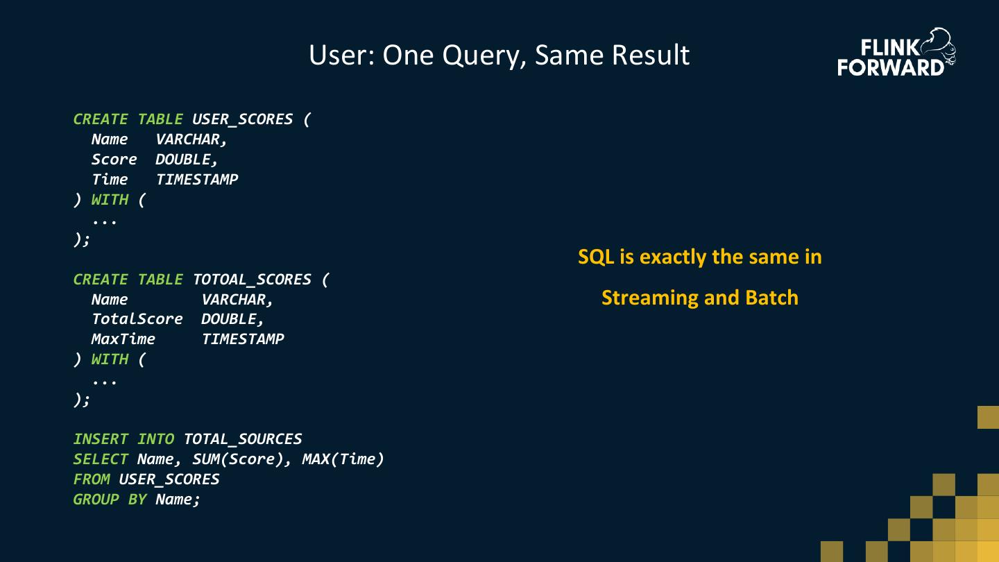 9 . User: One Query, Same Result CREATE TABLE USER_SCORES ( Name VARCHAR, Score DOUBLE, Time TIMESTAMP ) WITH ( ... ); SQL is exactly the same in CREATE TABLE TOTOAL_SCORES ( Name VARCHAR, Streaming and Batch TotalScore DOUBLE, MaxTime TIMESTAMP ) WITH ( ... ); INSERT INTO TOTAL_SOURCES SELECT Name, SUM(Score), MAX(Time) FROM USER_SCORES GROUP BY Name;
