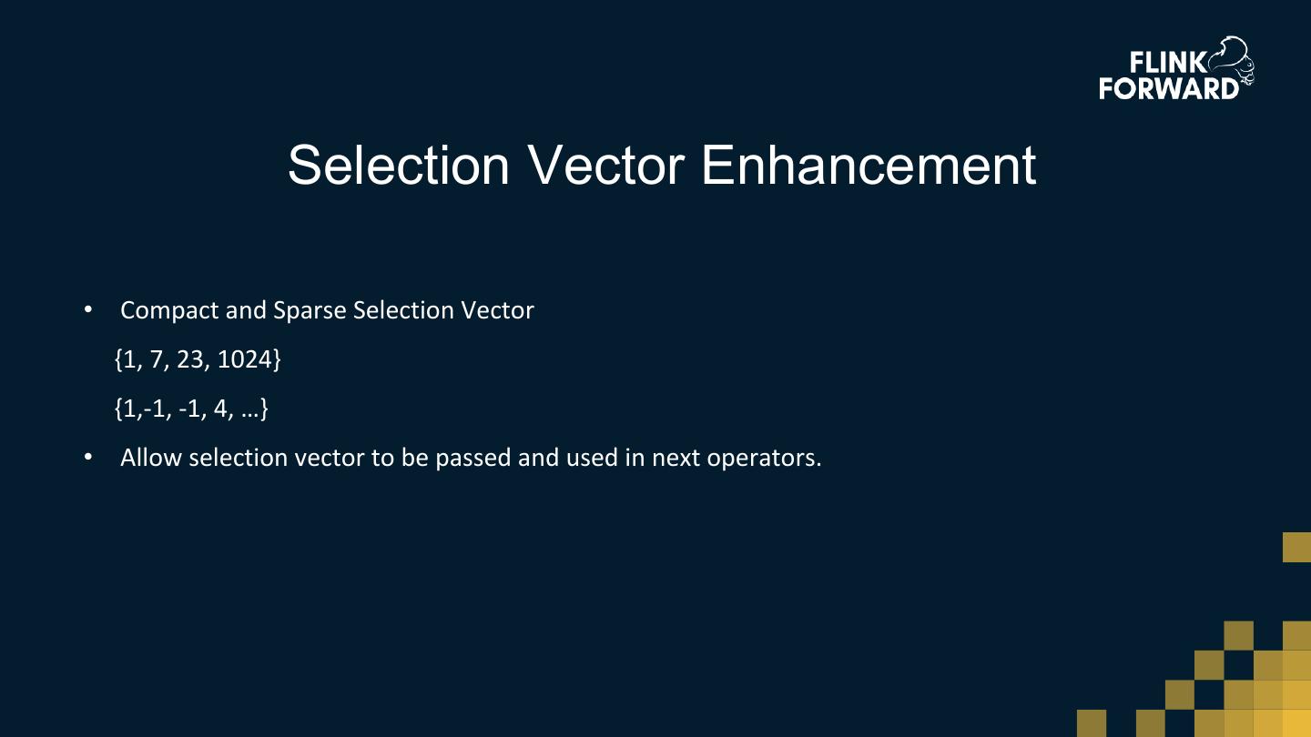13 . Selection Vector Enhancement • Compact and Sparse Selection Vector {1, 7, 23, 1024} {1,-1, -1, 4, …} • Allow selection vector to be passed and used in next operators.