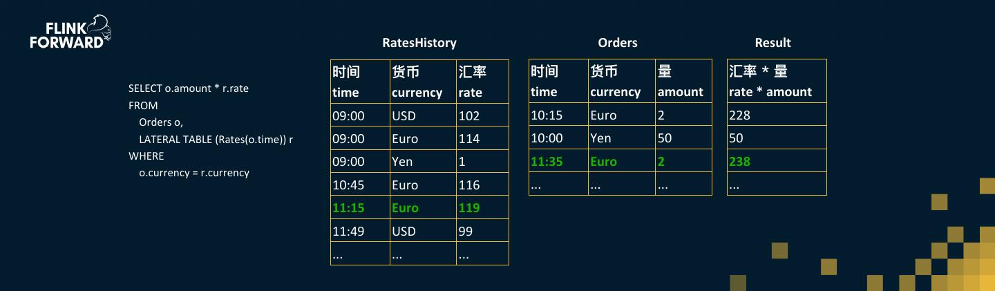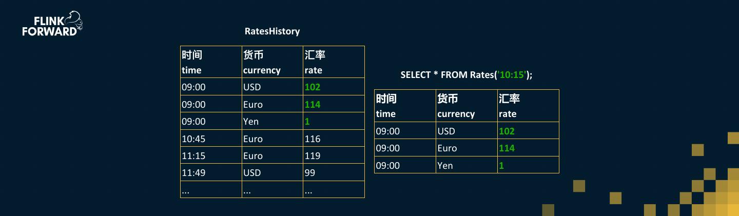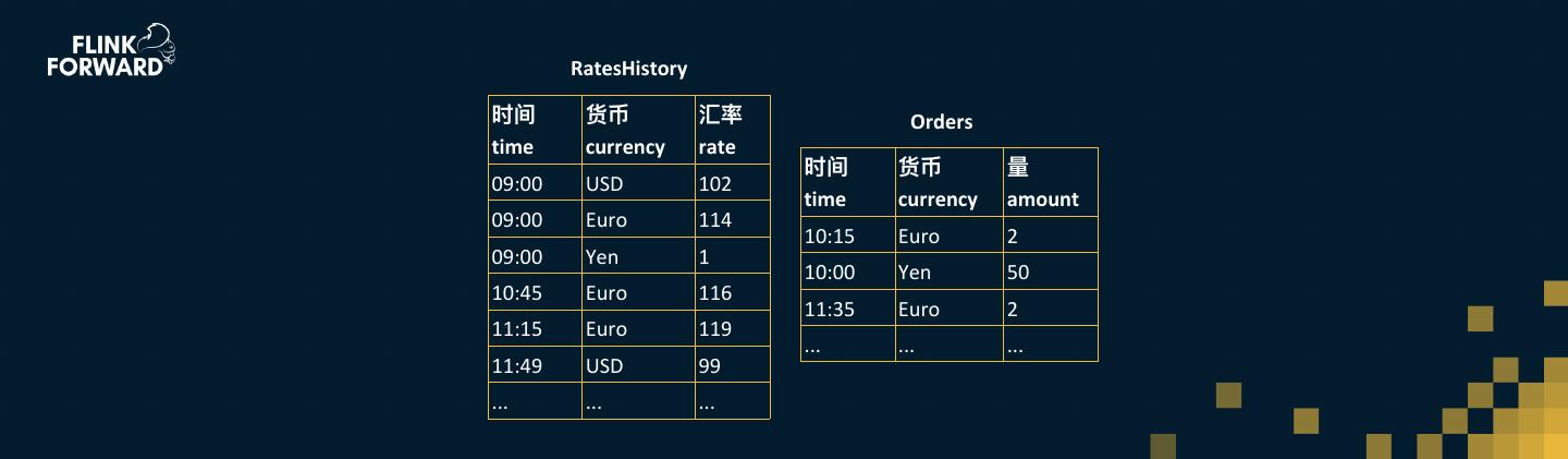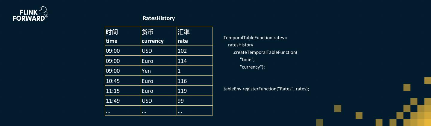 2 . RatesHistory ᳵ ᨵ૰ ሲ TemporalTableFunction rates = time currency rate ratesHistory 09:00 USD 102 .createTemporalTableFunction( 09:00 Euro 114 "time", "currency"); 09:00 Yen 1 10:45 Euro 116 11:15 Euro 119 tableEnv.registerFunction("Rates", rates); 11:49 USD 99 ... ... ...