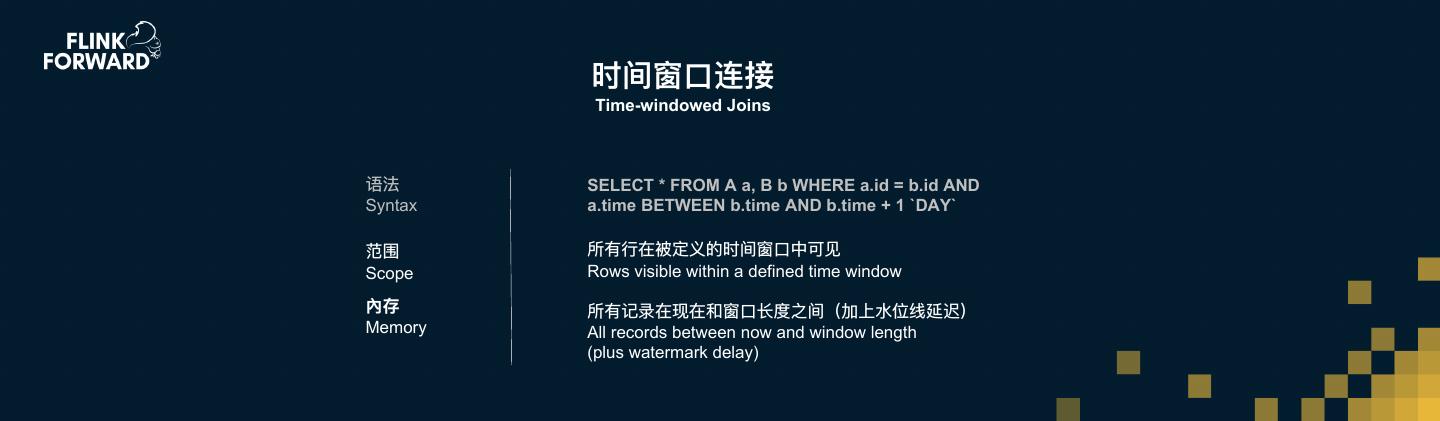 10 . ᳵᑻݗᬳള Time-windowed Joins ဩ SELECT * FROM A a, B b WHERE a.id = b.id AND Syntax a.time BETWEEN b.time AND b.time + 1 `DAY` ࢱ ಅํᤈࣁᤩਧԎጱᳵᑻݗӾݢᥠ Scope Rows visible within a defined time window 㲌ਂ ಅํᦕ୯ࣁሿࣁᑻݗᳩଶԏᳵҁےӤ֖ᕚ᬴҂ Memory All records between now and window length (plus watermark delay)