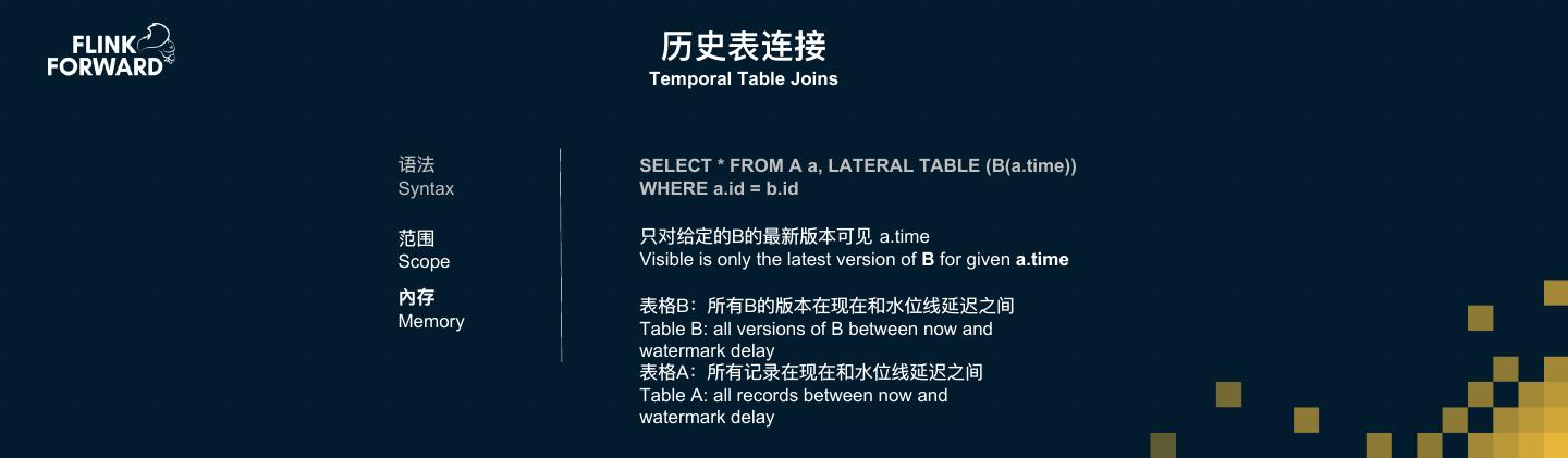 11 . ܲݥᤒᬳള Temporal Table Joins ဩ SELECT * FROM A a, LATERAL TABLE (B(a.time)) Syntax WHERE a.id = b.id ࢱ ݝᕳਧጱ%ጱ๋ෛᇇݢᥠ a.time Scope Visible is only the latest version of B for given a.time 㲌ਂ ᤒ໒%ғಅํ%ጱᇇࣁሿࣁ֖ᕚ᬴ԏᳵ Memory Table B: all versions of B between now and watermark delay ᤒ໒$ғಅํᦕ୯ࣁሿࣁ֖ᕚ᬴ԏᳵ Table A: all records between now and watermark delay