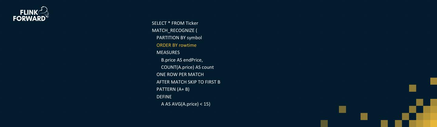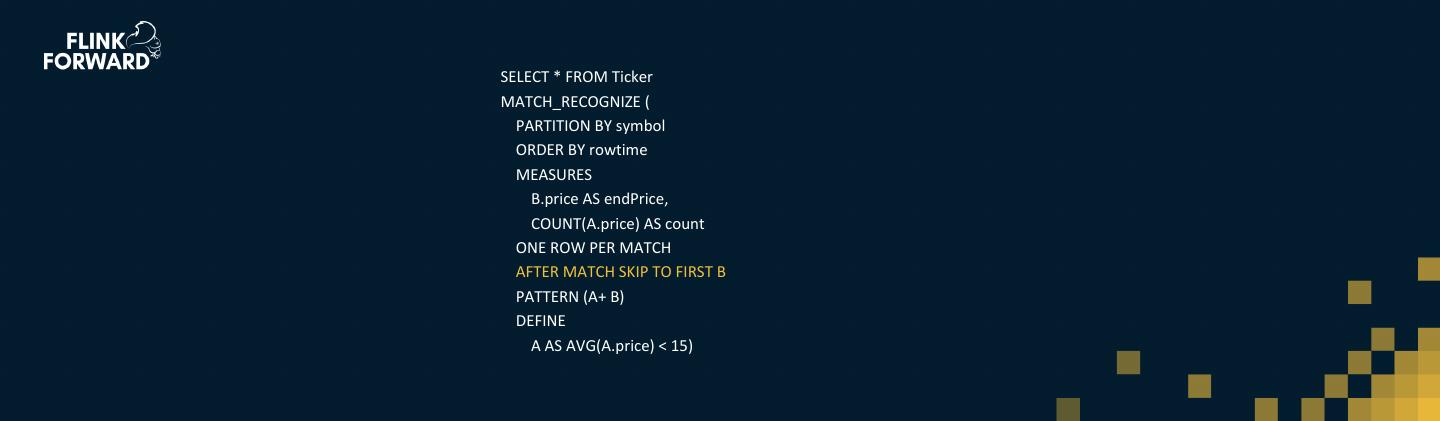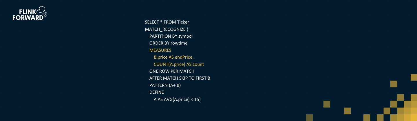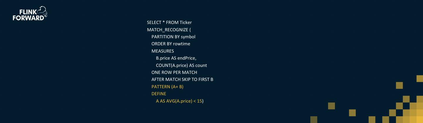 15 .SELECT * FROM Ticker MATCH_RECOGNIZE ( PARTITION BY symbol ORDER BY rowtime MEASURES B.price AS endPrice, COUNT(A.price) AS count ONE ROW PER MATCH AFTER MATCH SKIP TO FIRST B PATTERN (A+ B) DEFINE A AS AVG(A.price) < 15)