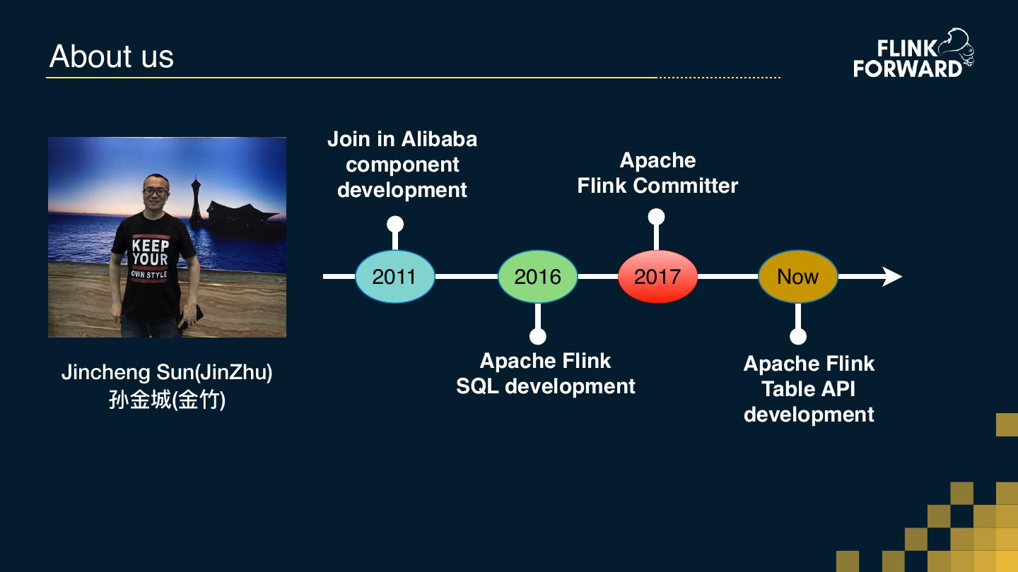 2 .About us Join in Alibaba component Apache development Flink Committer 2011 2016 2017 Now Apache Flink Apache Flink Jincheng Sun(JinZhu) SQL development Table API 孙⾦金金城(⾦金金⽵竹) development