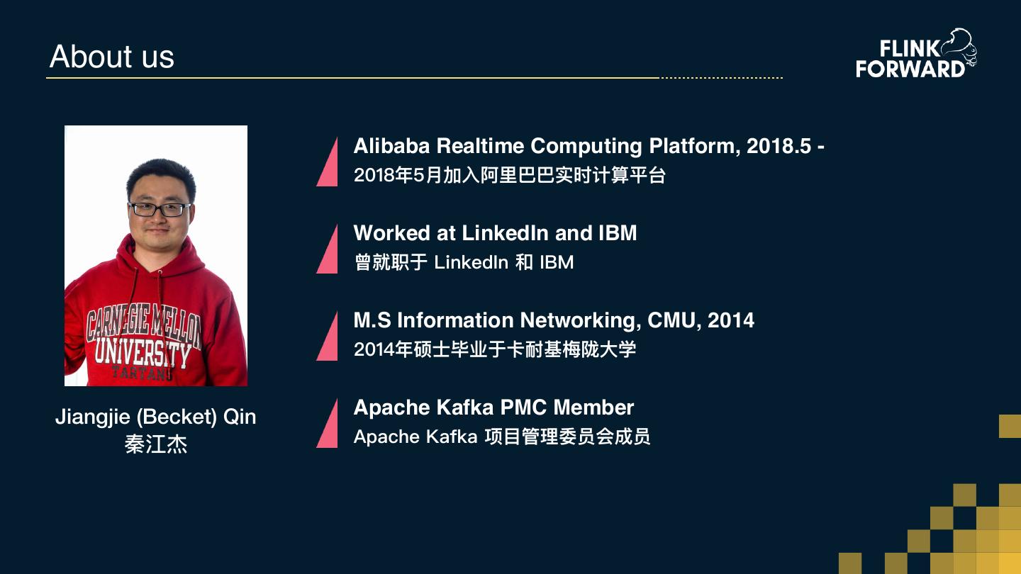 3 .About us Alibaba Realtime Computing Platform, 2018.5 - 2018年年5⽉月加⼊入阿⾥里里巴巴实时计算平台 Worked at LinkedIn and IBM 曾就职于 LinkedIn 和 IBM M.S Information Networking, CMU, 2014 2014年年硕⼠士毕业于卡耐基梅梅陇⼤大学 Jiangjie (Becket) Qin Apache Kafka PMC Member 秦江杰 Apache Kafka 项⽬目管理理委员会成员