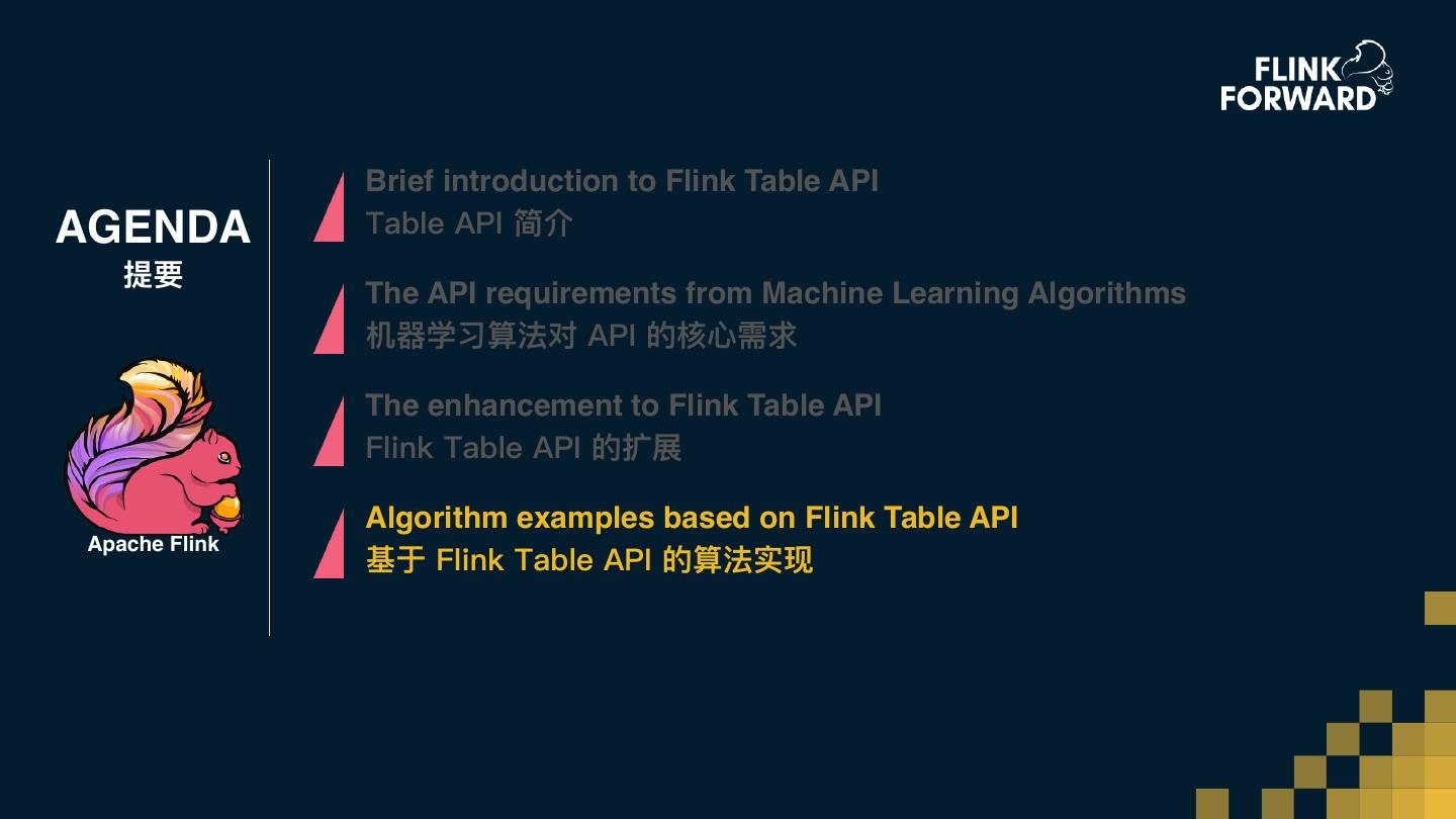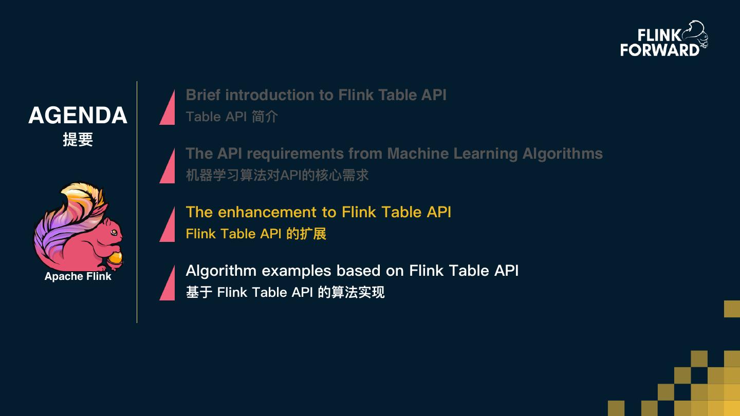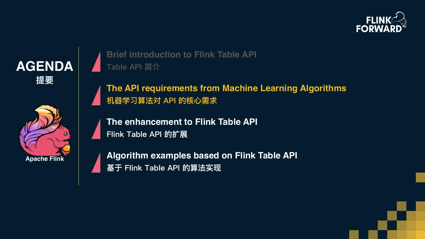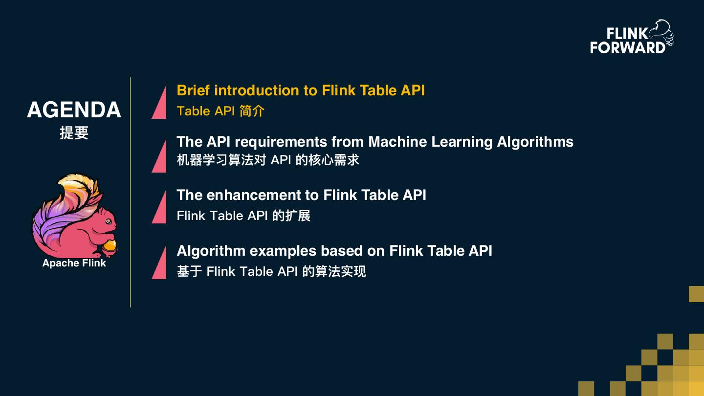 12 . Brief introduction to Flink Table API AGENDA Table API 简介 提要 The API requirements from Machine Learning Algorithms 机器器学习算法对 API 的核⼼心需求 The enhancement to Flink Table API Flink Table API 的扩展 Apache Flink Algorithm examples based on Flink Table API 基于 Flink Table API 的算法实现