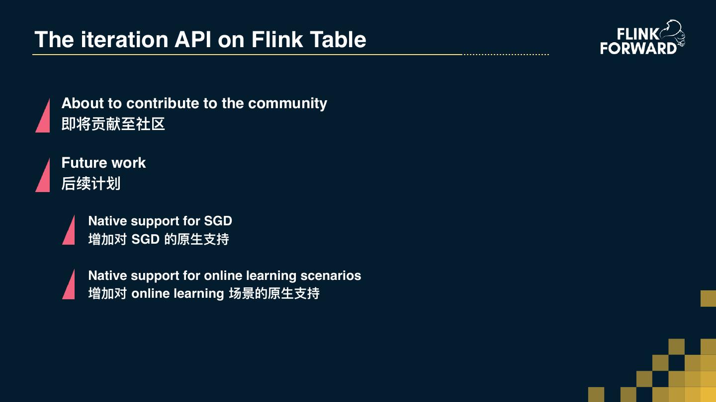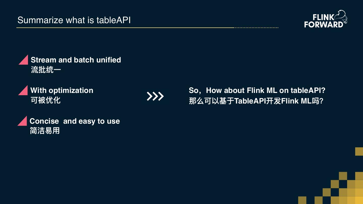 10 .Summarize what is tableAPI Stream and batch unified 流批统⼀一 With optimization So,How about Flink ML on tableAPI? 可被优化 那么可以基于TableAPI开发Flink ML吗? Concise and easy to use 简洁易易⽤用