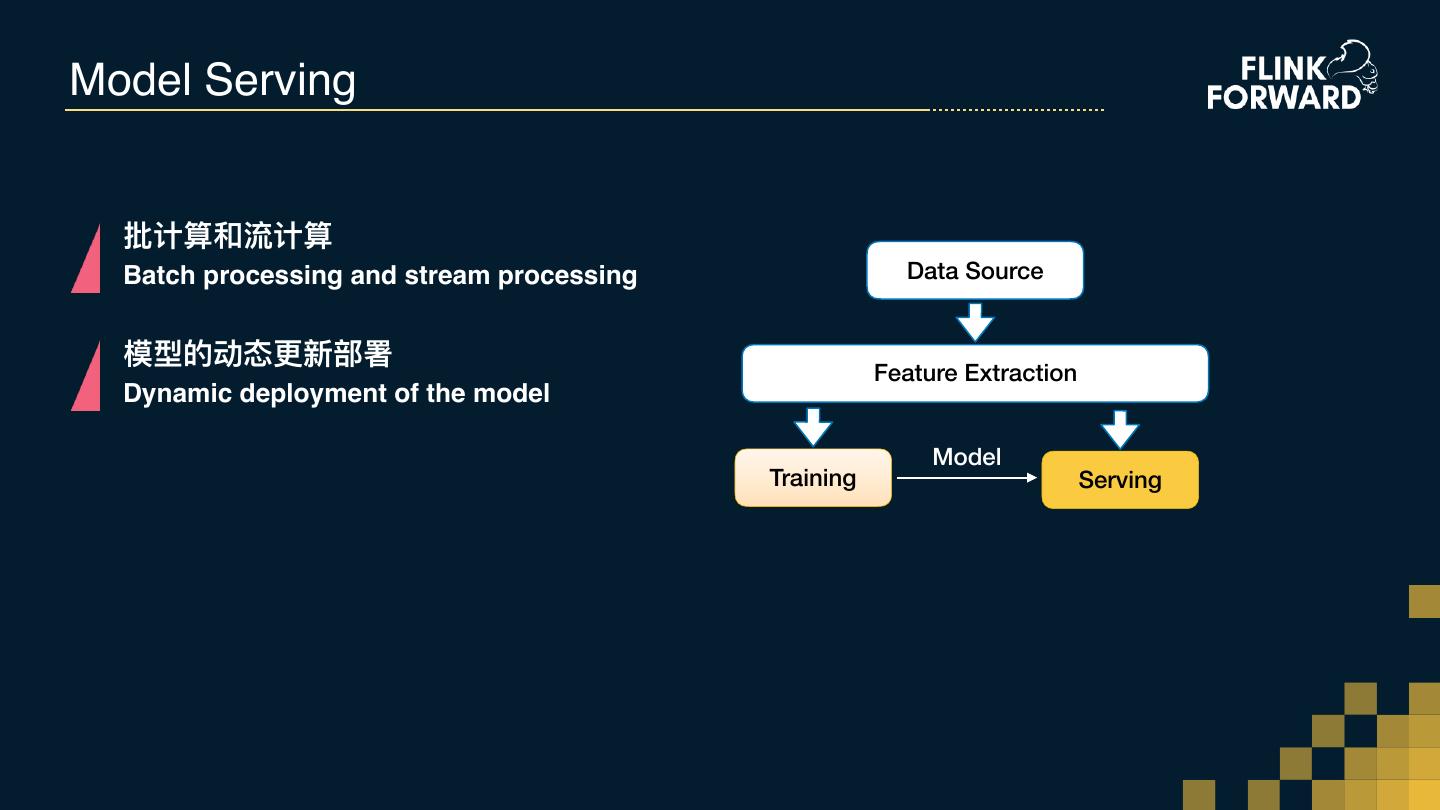 15 .Model Serving 批计算和流计算 Batch processing and stream processing Data Source 模型的动态更更新部署 Feature Extraction Dynamic deployment of the model Model Training Serving