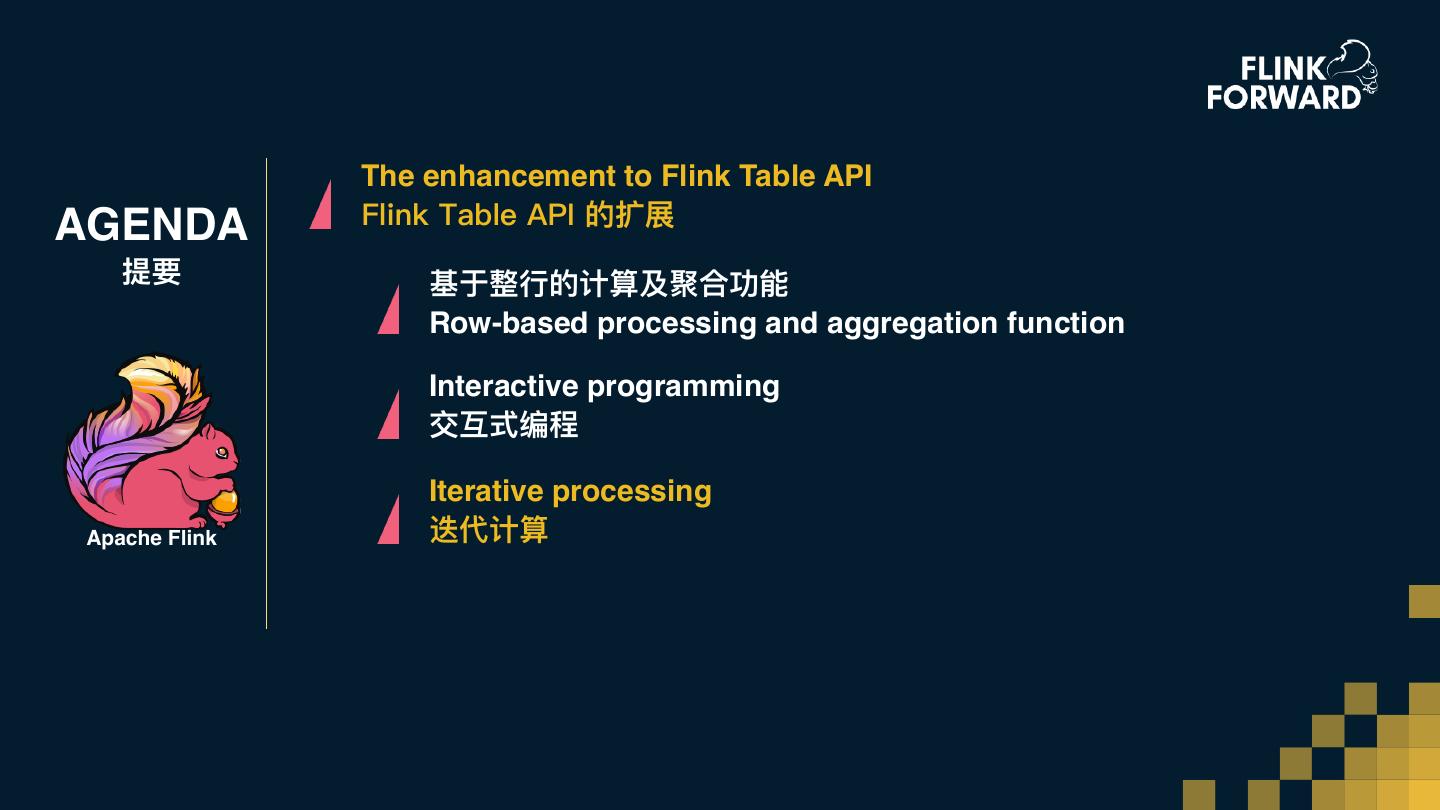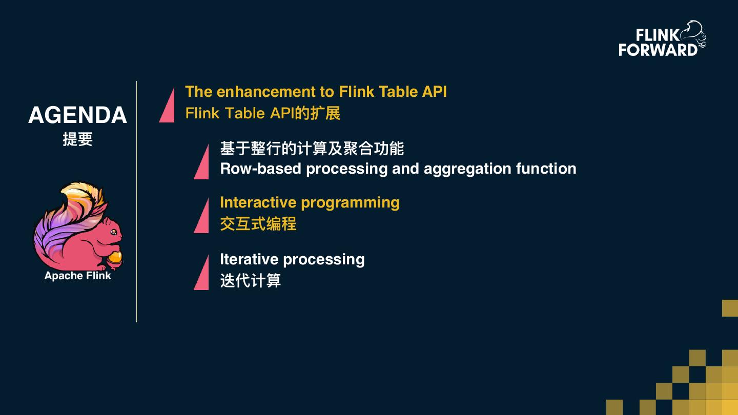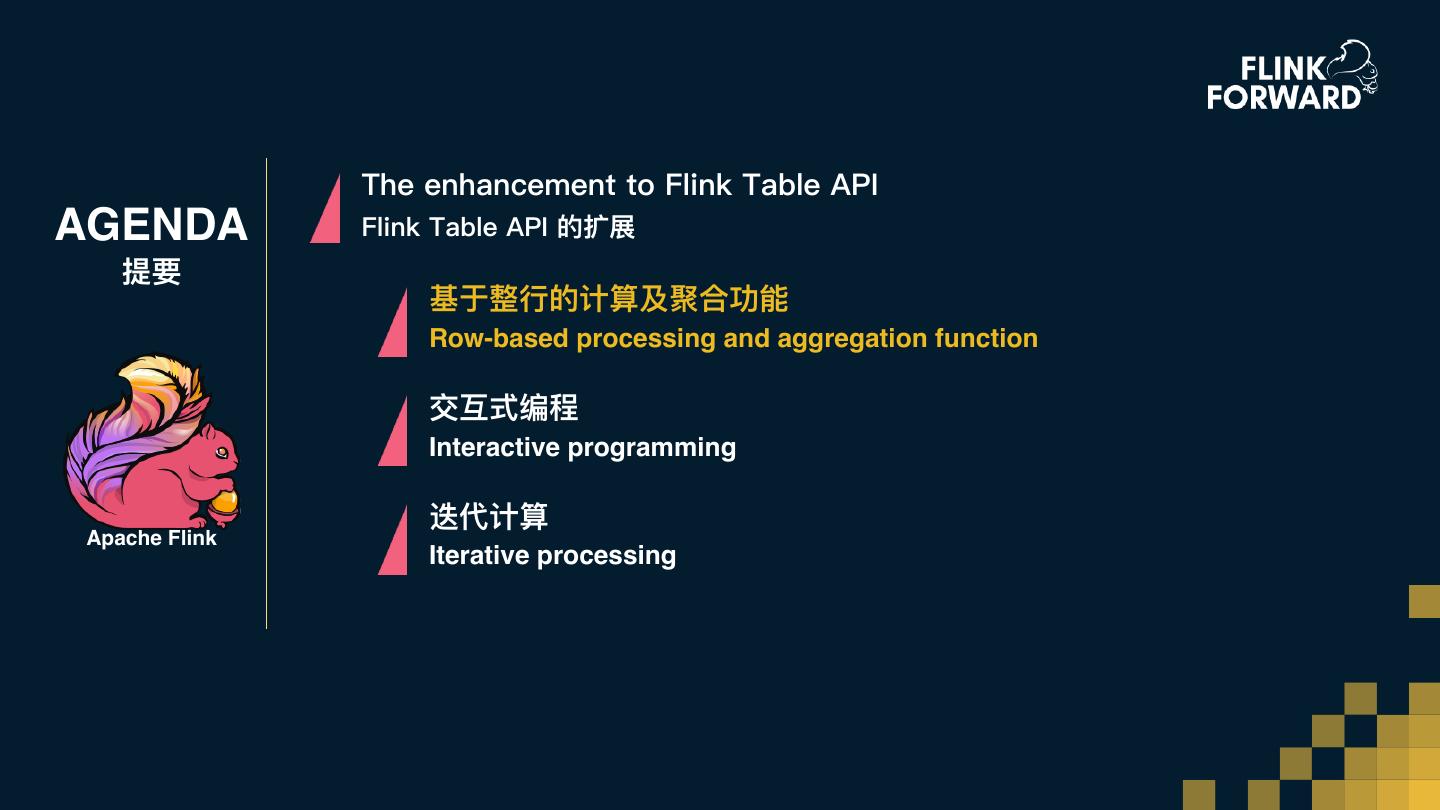 26 . The enhancement to Flink Table API AGENDA Flink Table API的扩展 提要 基于整⾏行行的计算及聚合功能 Row-based processing and aggregation function Interactive programming 交互式编程 Iterative processing Apache Flink 迭代计算