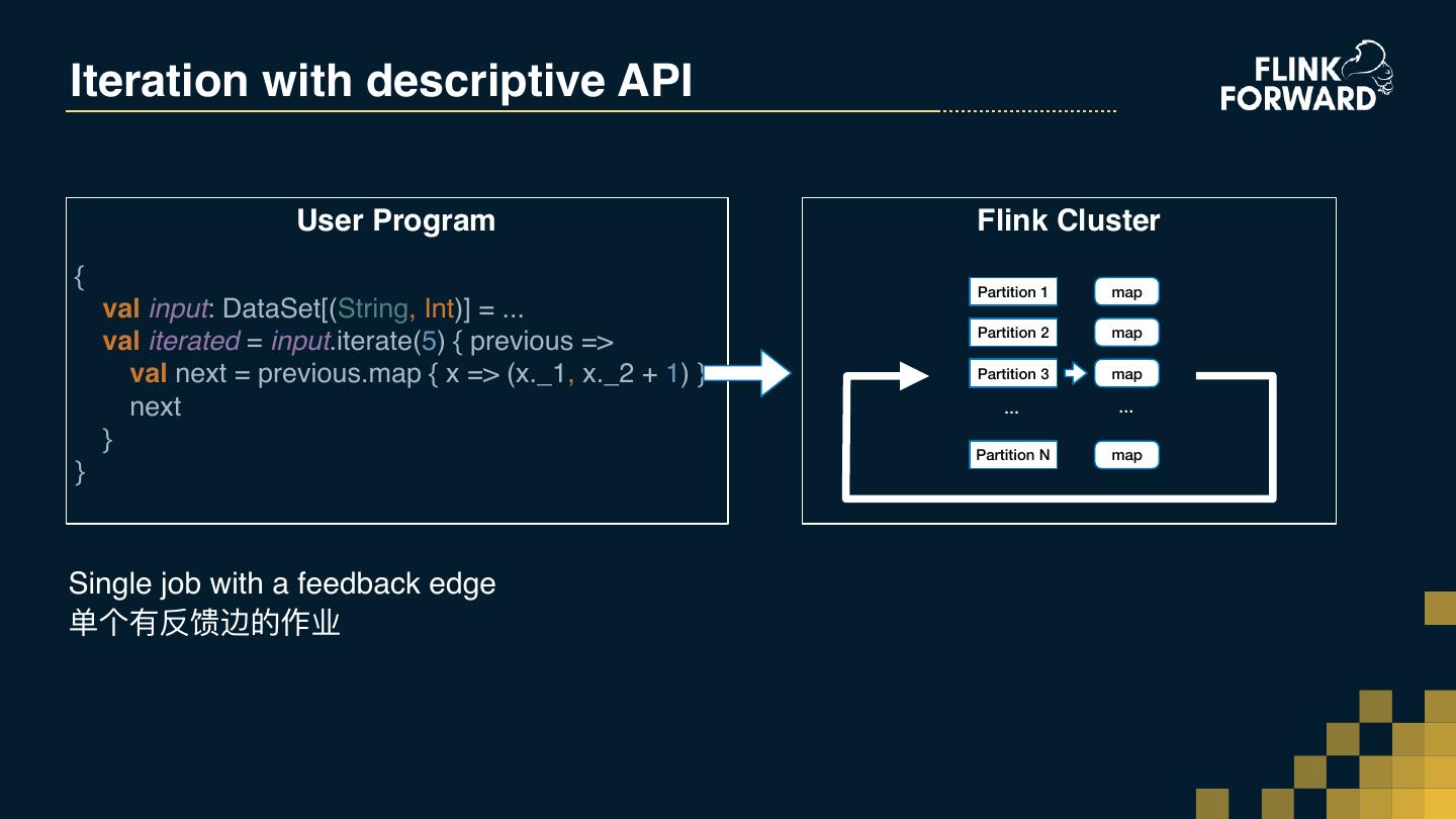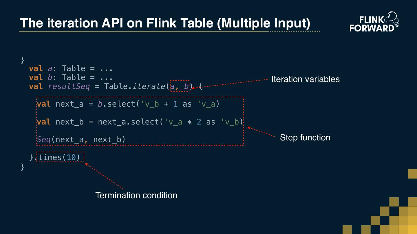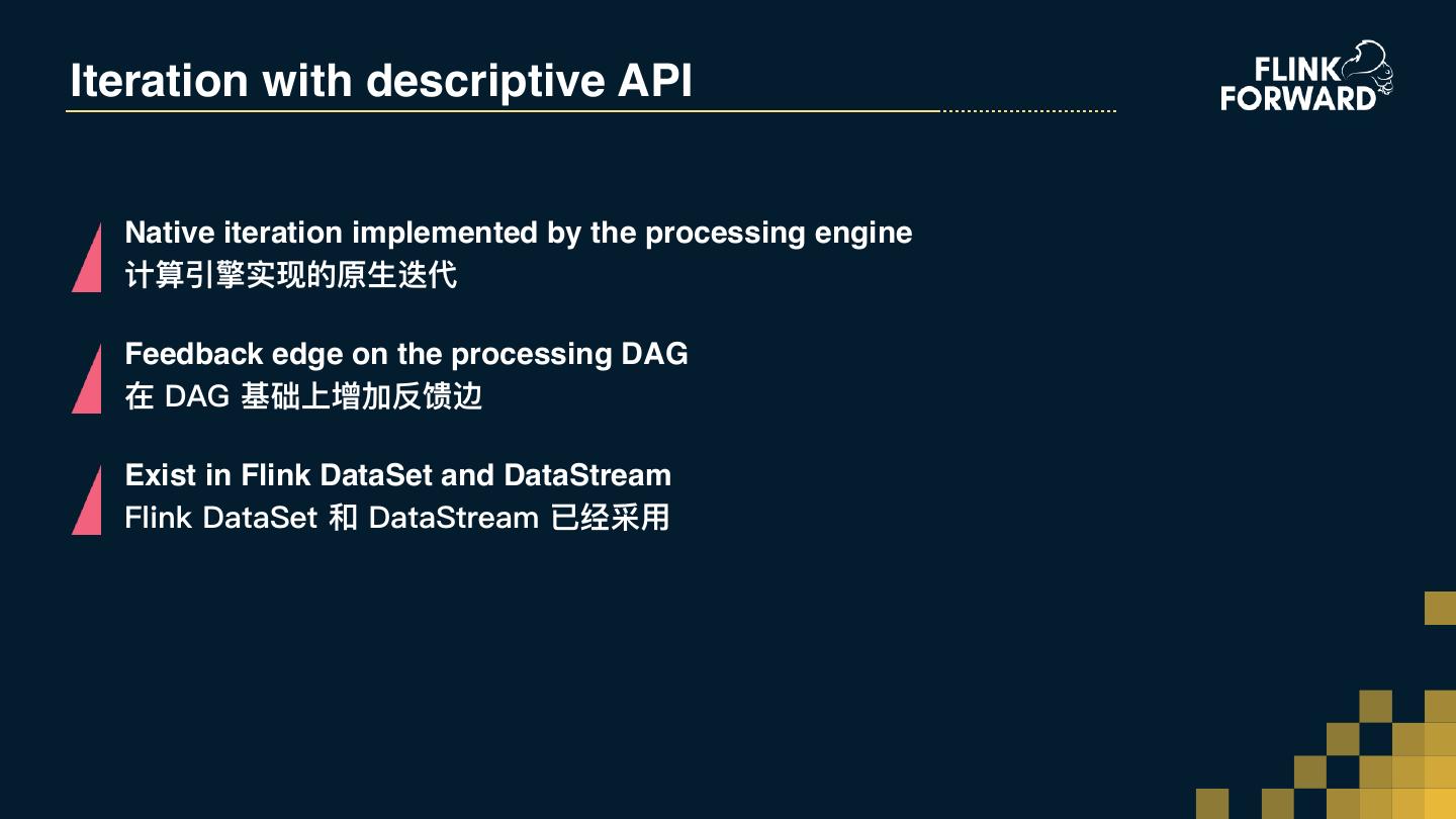 26 . The enhancement to Flink Table API AGENDA Flink Table API的扩展 提要 基于整⾏行行的计算及聚合功能 Row-based processing and aggregation function Interactive programming 交互式编程 Iterative processing Apache Flink 迭代计算