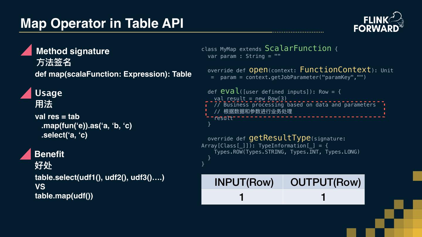 20 .Map Operator in Table API class MyMap extends ScalarFunction { Method signature var param : String = "" ⽅方法签名 override def open(context: FunctionContext): Unit def map(scalaFunction: Expression): Table = param = context.getJobParameter("paramKey","") Usage def eval([user defined inputs]): Row = { val result = new Row(3) ⽤用法 // Business processing based on data and parameters // 根据数据和参数进⾏行行业务处理理 val res = tab result .map(fun(‘e)).as(‘a, ‘b, ‘c) } .select(‘a, ‘c) override def getResultType(signature: Array[Class[_]]): TypeInformation[_] = { Types.ROW(Types.STRING, Types.INT, Types.LONG) Benefit } 好处 } table.select(udf1(), udf2(), udf3()….) VS INPUT(Row) OUTPUT(Row) table.map(udf()) 1 1