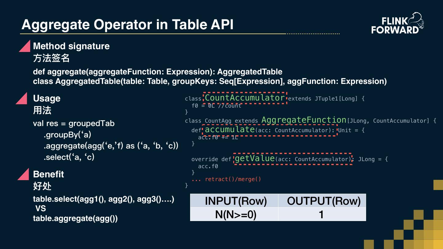 22 .Aggregate Operator in Table API Method signature ⽅方法签名 def aggregate(aggregateFunction: Expression): AggregatedTable class AggregatedTable(table: Table, groupKeys: Seq[Expression], aggFunction: Expression) Usage class CountAccumulator extends JTuple1[Long] { f0 = 0L //count ⽤用法 } val res = groupedTab class CountAgg extends AggregateFunction[JLong, CountAccumulator] { def accumulate(acc: CountAccumulator): Unit = { .groupBy(‘a) acc.f0 += 1L .aggregate(agg(‘e,’f) as (‘a, ‘b, ‘c)) } .select(‘a, ‘c) override def getValue(acc: CountAccumulator): JLong = { acc.f0 } Benefit ... retract()/merge() 好处 } table.select(agg1(), agg2(), agg3()….) INPUT(Row) OUTPUT(Row) VS table.aggregate(agg()) N(N>=0) 1