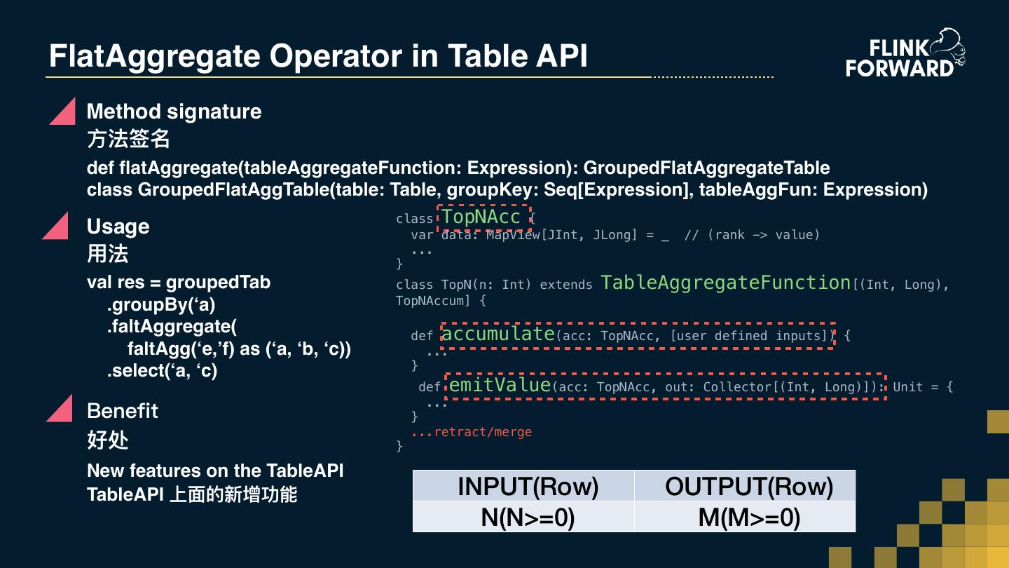 23 .FlatAggregate Operator in Table API Method signature ⽅方法签名 def flatAggregate(tableAggregateFunction: Expression): GroupedFlatAggregateTable class GroupedFlatAggTable(table: Table, groupKey: Seq[Expression], tableAggFun: Expression) class TopNAcc { Usage var data: MapView[JInt, JLong] = _ // (rank -> value) ⽤用法 } ... val res = groupedTab class TopN(n: Int) extends TableAggregateFunction[(Int, Long), .groupBy(‘a) TopNAccum] { .faltAggregate( def accumulate(acc: TopNAcc, [user defined inputs]) { faltAgg(‘e,’f) as (‘a, ‘b, ‘c)) ... } .select(‘a, ‘c) def emitValue(acc: TopNAcc, out: Collector[(Int, Long)]): Unit = { ... Benefit } ...retract/merge 好处 } New features on the TableAPI TableAPI 上⾯面的新增功能 INPUT(Row) OUTPUT(Row) N(N>=0) M(M>=0)